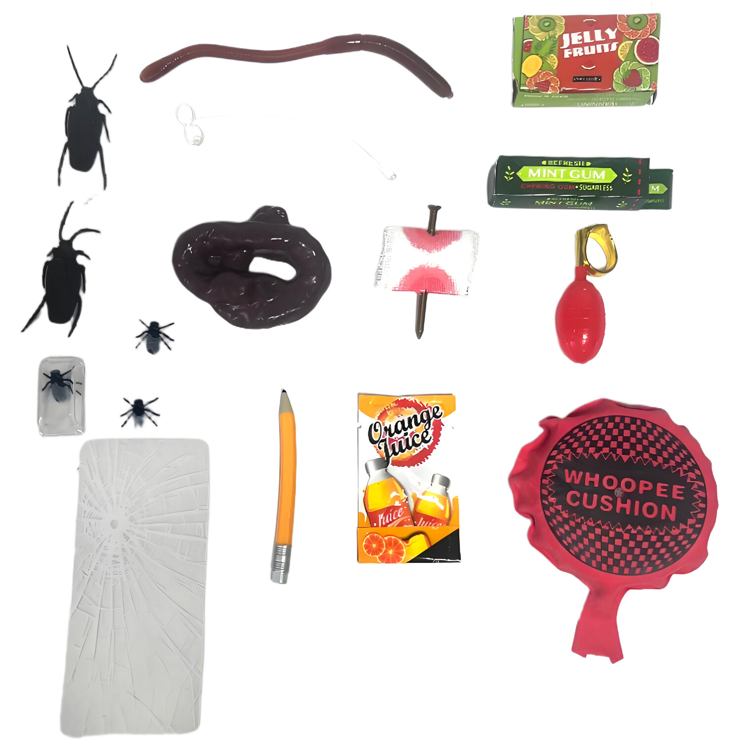 Surprise your friends with this Practical Jokes Set. This collection features fake bugs, a snake, a whoopee cushion, a fake glass, a soft pencil, jelly packaging, candy boxes, and more. With more than 12 practical jokes for pranking, this toy is perfect for people of all ages as it provides endless laughter and enjoyment.