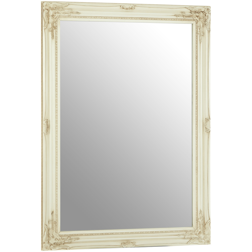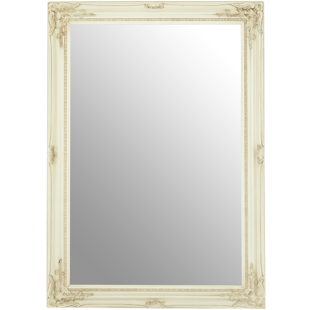 Go for a masterpiece for your walls with this Premier Housewares Andrey Bone White Wall Mirror. The mirror, featuring a bone-white finish, has bevelled corners and sides that accentuate the gentle depth of its frame. Its outer edges are adorned with a beaded detail distinguished by a filigree pattern on the inner layer. Elegantly carved decorative motifs on each corner contribute to its striking elegance.