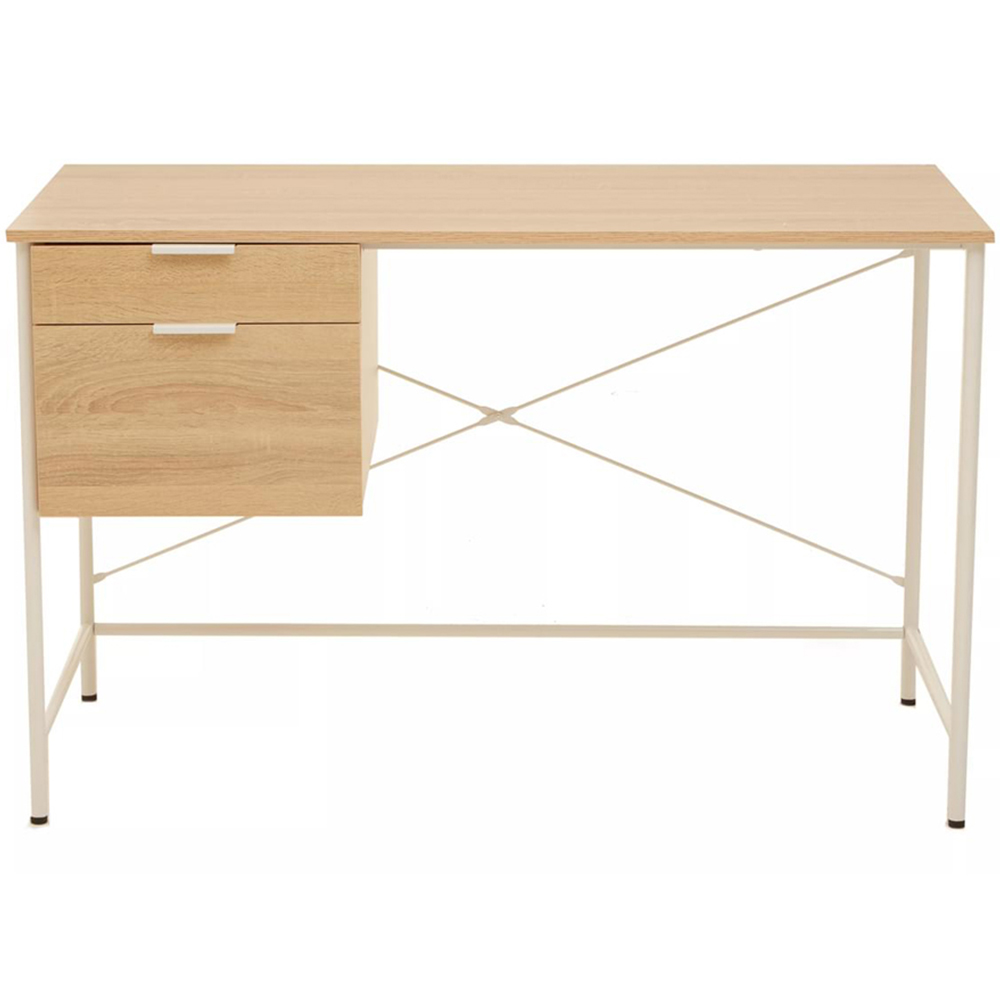 Add a modern touch to your home office with Premier Housewares Bradbury 2 Drawer Natural Oak Veneer Desk. The Bradbury desk is a perfect choice for commercial places or home offices. It features a rectangular natural oak effect wooden top that sits neatly on a white metal frame, giving it a subtle industrial style. With two drawers, this desk is ideal for keeping office and homeschooling spaces clean and organized.