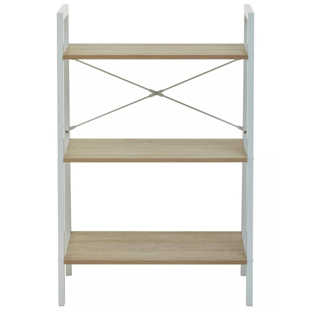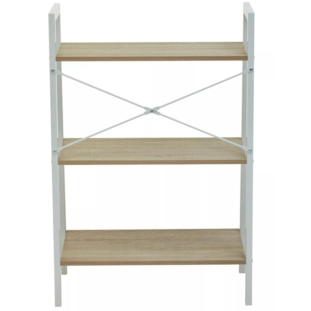 The Premier Housewares Bradbury 3 Tier Natural Oak Veneer Ladder Shelf Unit features rectangular shelves in a natural oak wood effect with a metal frame in the white powder coating. The 3-tier shelving is ideal for pairing with contemporary and subtle industrial themes in the home office space. This stylish and sturdy unit, made from wood and metal, gives a mid-century modern feel.