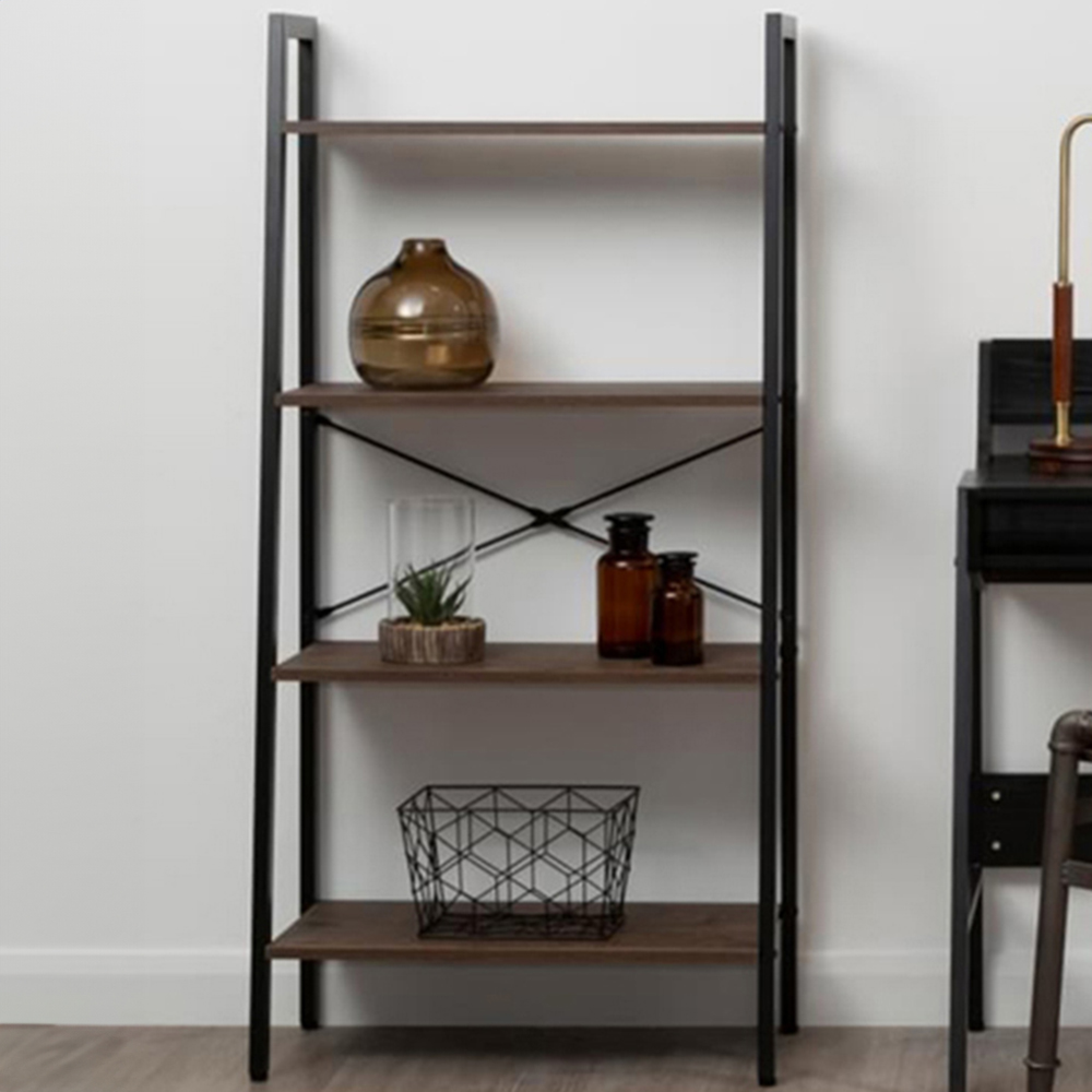 Display your books and decorative items in style with this Premier Housewares Bradbury 4 Tier Dark Oak Veneer Ladder Shelf Unit. The rectangular wooden shelves boast a dark oak veneering effect that sits neatly on the frame in the black powder coating finish. This stylish and sturdy unit, made from wood and metal, gives a mid-century modern feel.