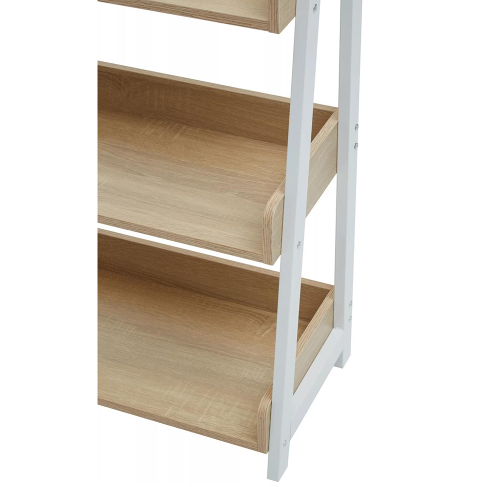 Make a stylish and practical addition to your room with Premier Housewares Bradbury 5 Tier Natural Oak Shelf Unit. The subtle industrial style of the Bradbury shelf unit makes it ideal for showcasing books and decoration pieces. The rectangular wooden shelves with raised edges are manufactured from natural oak effect veneer, and the white metal frame contributes to the mid-century modern feel. It has a sleek, angular frame. This unit offers the perfect storage solution.