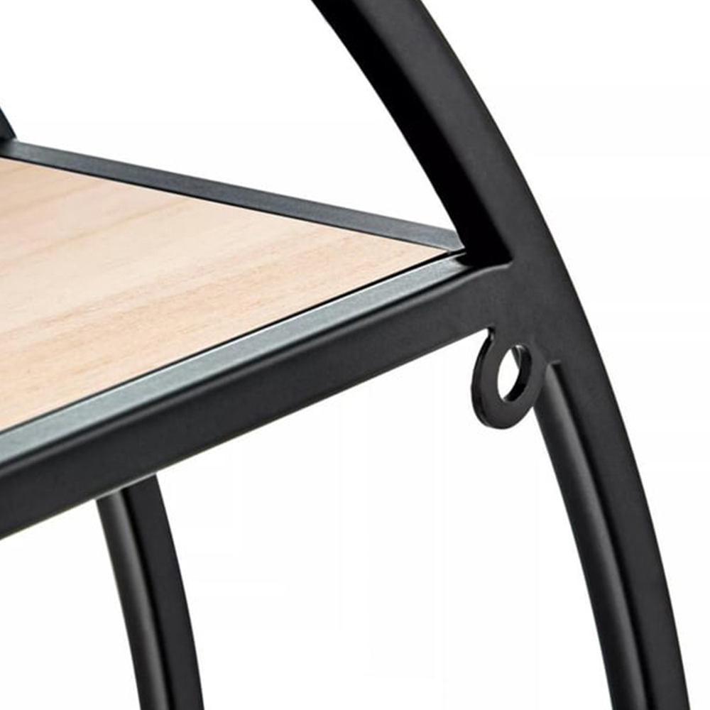 The Premier Housewares Brixton 3 Tier Round Metal Shelf showcases a sleek black powder coated metal frame. It elegantly links three wooden shelves, resulting in a captivating abstract design with a modern-art flair.