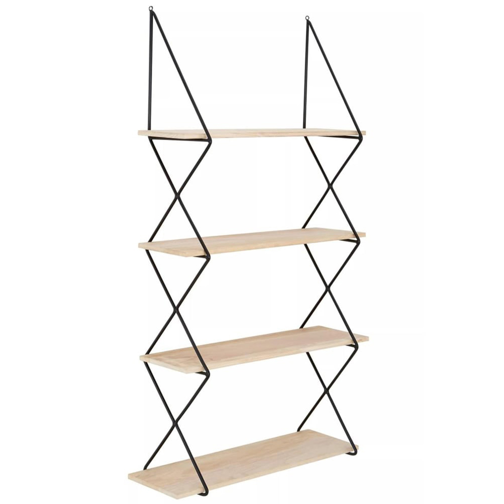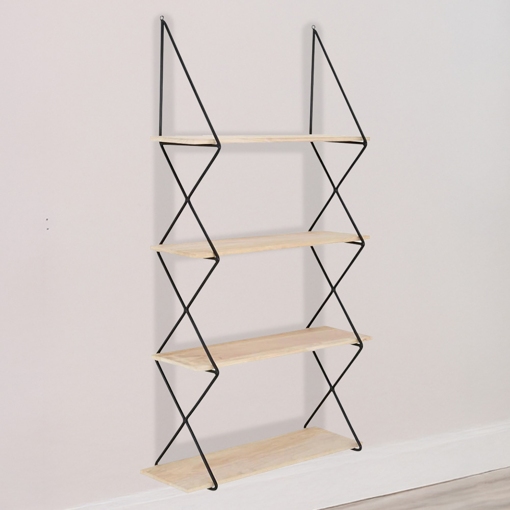 The Premier Housewares Brixton 4 Layer Shelf features four rectangular shelves, all of equal length, made from light wood. These shelves have a subtle graining that adds texture to their appearance. The shelf is supported by a metal frame that creates a criss-cross design and has a powdered black finish. It is important to note that the product does not come with wall fittings.
