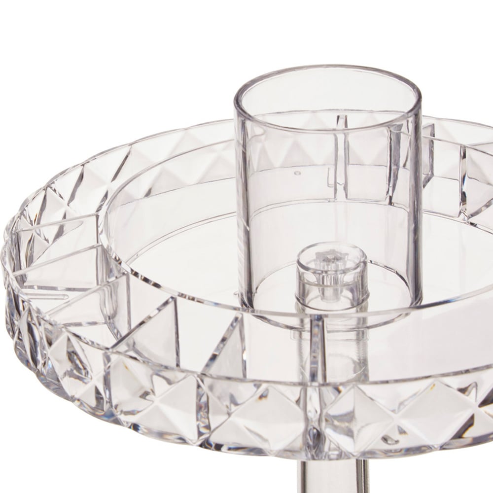 Meticulously handcrafted, this two-tier cosmetic organiser from Premier Housewares articulates crystal-like transparency accessorised with diamond texture. With the revolving feature, the dividers ensure everyday makeup products are organised and close to hand.