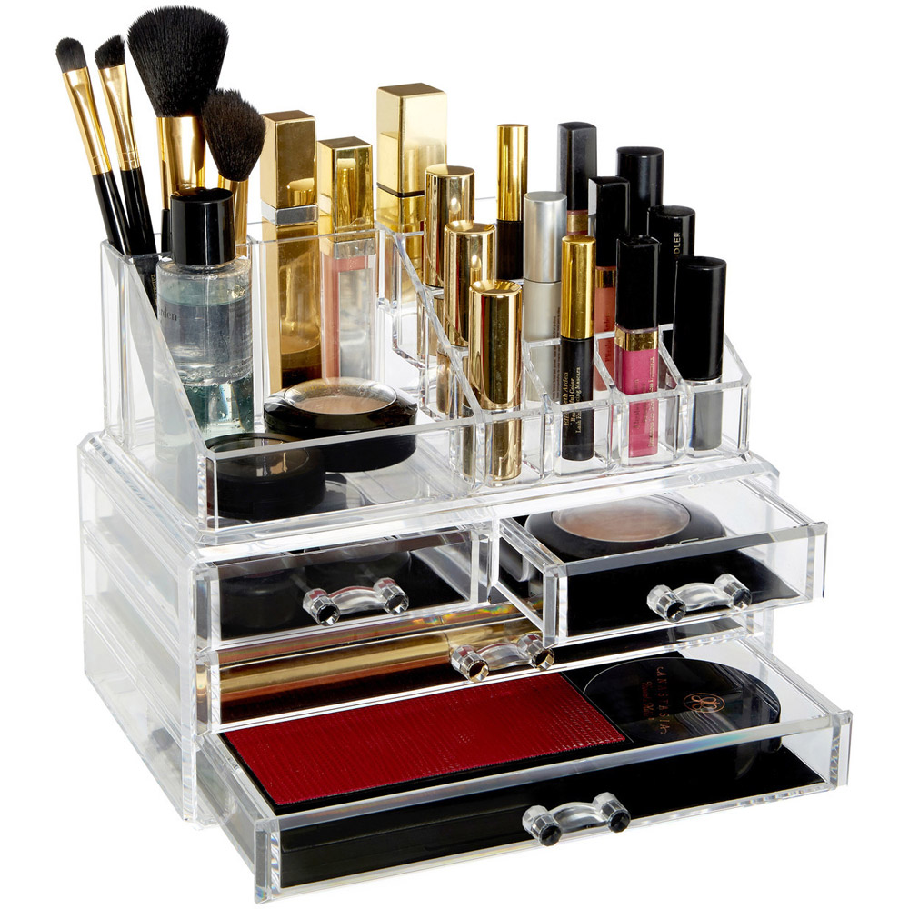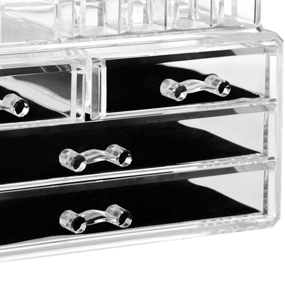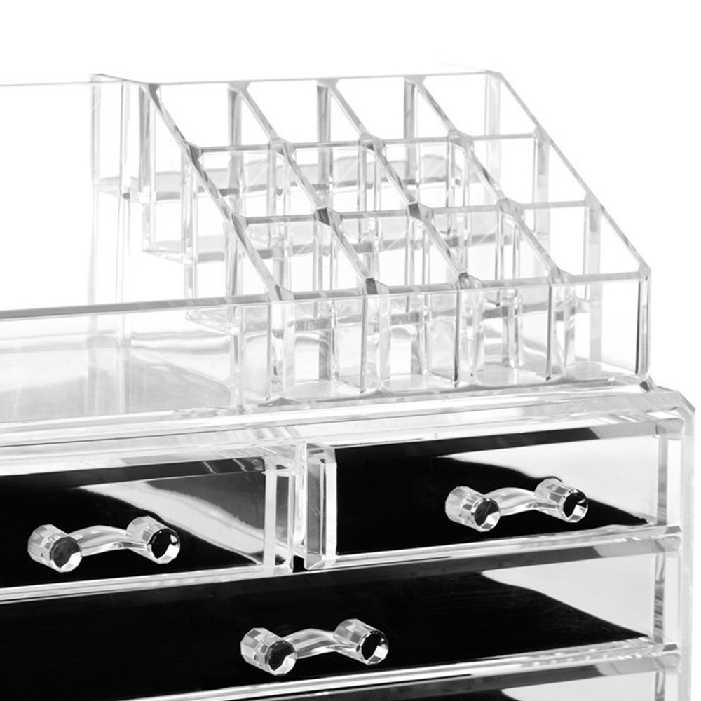 Keep makeup items organised with this practical and stylish cosmetics organiser from Premier Housewares. Its four useful drawers have a black lining which provides a contrast to the transparent construction. Above the drawers, there are a total of sixteen separate compartments that will help you keep your cosmetics organised.