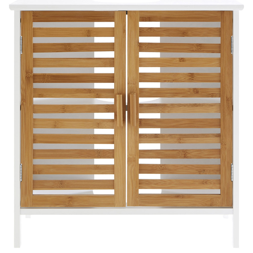 Make a practical yet stylish addition to your bathroom with this Double Door and Shelf Under Sink Cabinet from Premier Housewares. The cabinet's crisp white finish and golden doors create a fresh and clean coastal vibe. Both doors are made from renewable bamboo wood, with a slatted design that adds to its airy feel. A pair of slim bamboo handles make for easy opening and closing, while the single shelf within is suitable for keeping towels and toiletries in place.