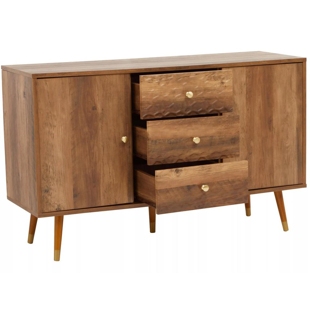 The Premier Housewares Frida sideboard showcases a sleek design with its wood veneer effect. It is equipped with two doors and showcases intricate patterns on the front of its drawers. This sideboard offers generous storage space and is supported by sturdy slanted wooden legs. It combines elements of mid-century modern and traditional design, making it a versatile and stylish addition to any space.