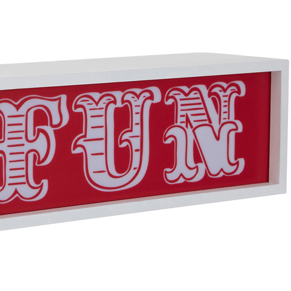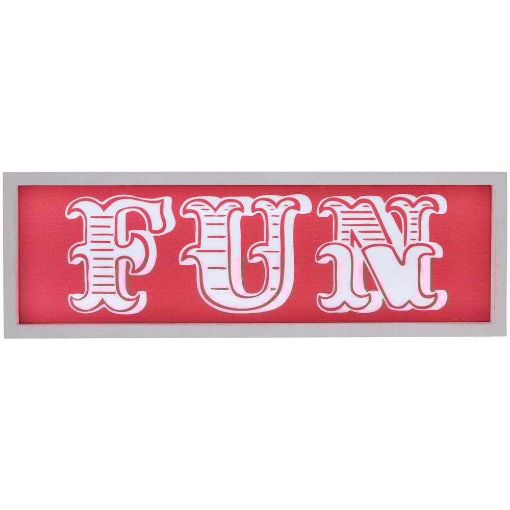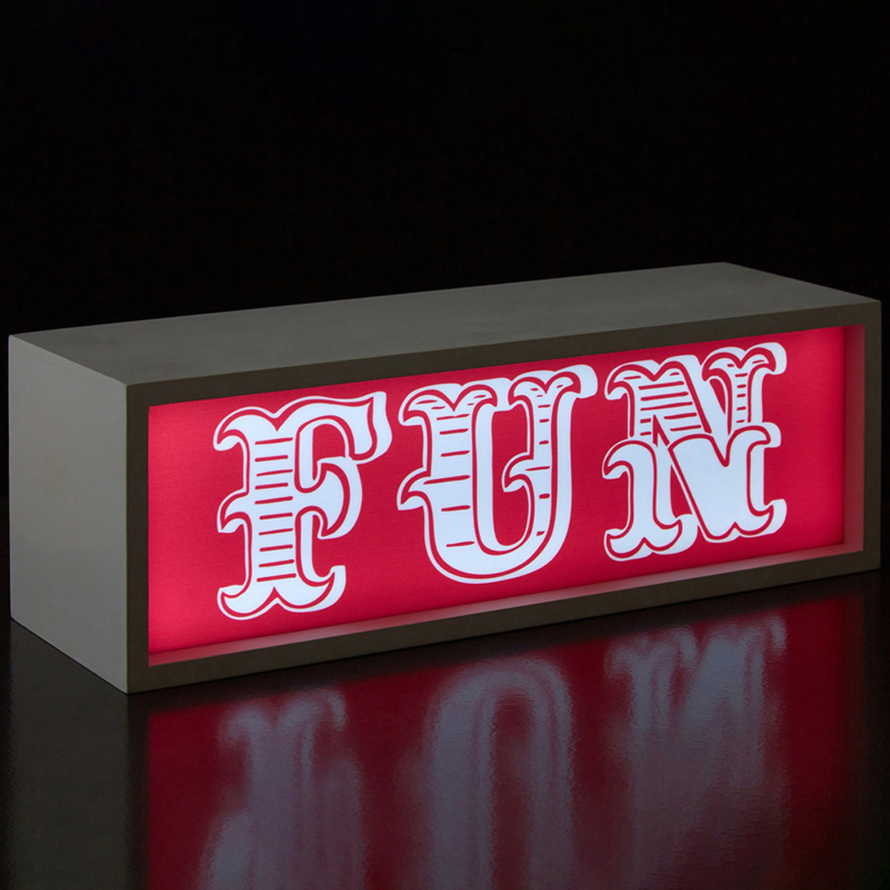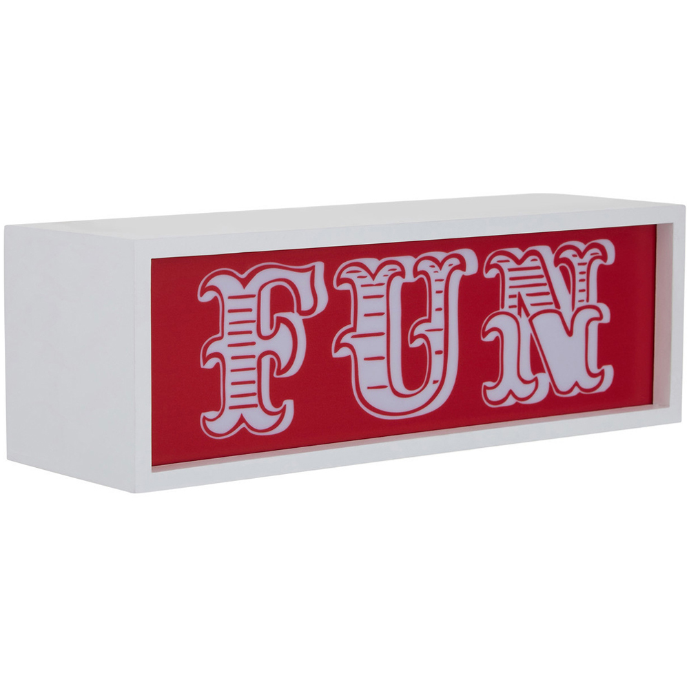 Lift your home aesthetics effortlessly with this Premier Housewares Fun Led Light Box. The box, made from durable MDF, features a translucent red facing with complementing white finish that highlights the word "Fun" written in a carnival-style font. It creates a subtle glow when in use, and with a pair of metal hooks on its back, this lightbox can be easily displayed on a wall, a chest or sideboard. It requires 1 x LED Bulb (Included). Please click here to find our range of lightbulbs.