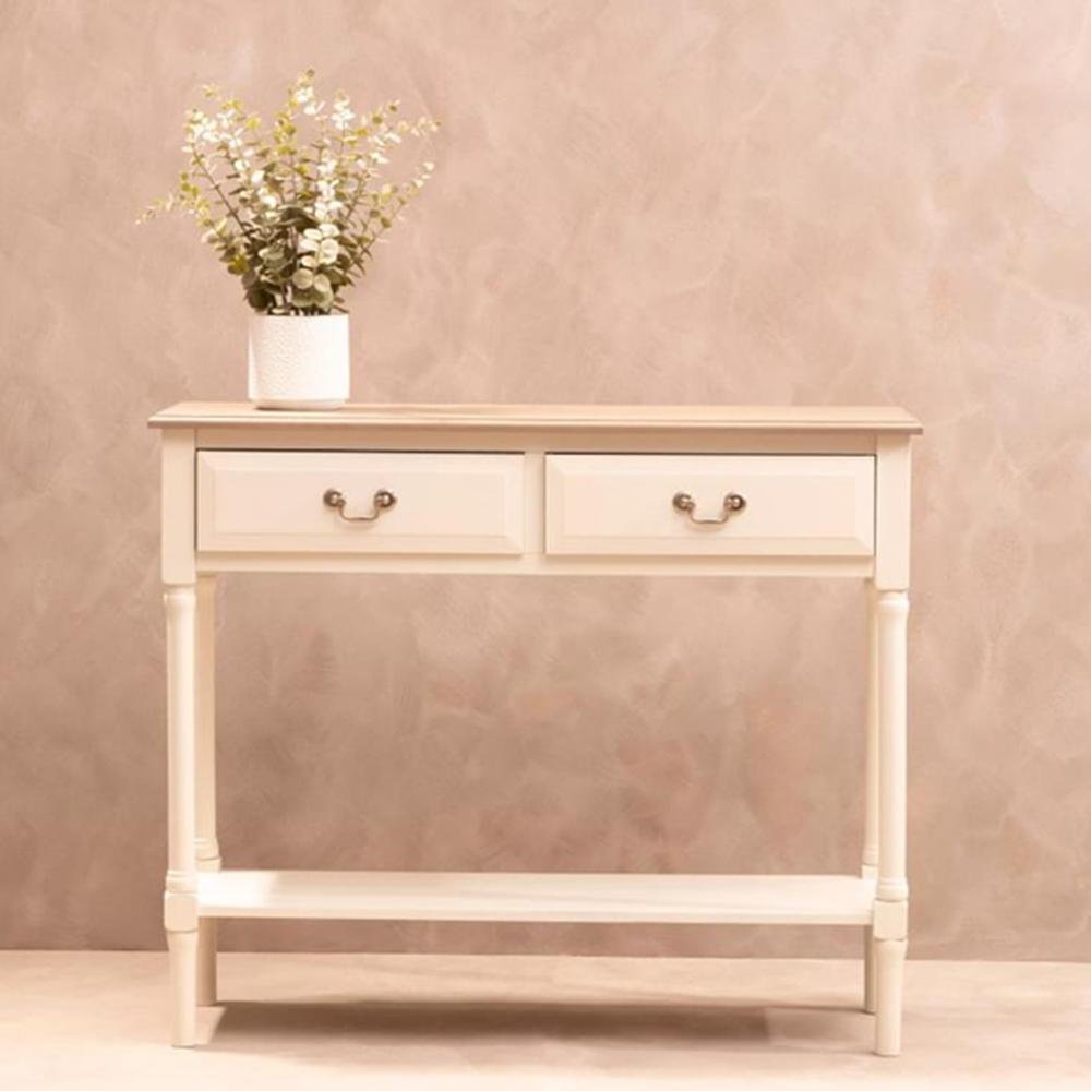 Add a beautiful feature to your hallway or home entrance with the Premier Housewares Heritage 2 Drawer Console Table. This table is crafted with pine wood, ensuring a natural grain with a vintage finish accentuating each contour. This vintage-style table featuring a winter melody tabletop will stand out with its subtly carved construction and ivory frame. The table has two drawers, each with a sleek designed handle that perfectly coordinates with the table design. Further, it has a lower shelf that offers additional storage space.