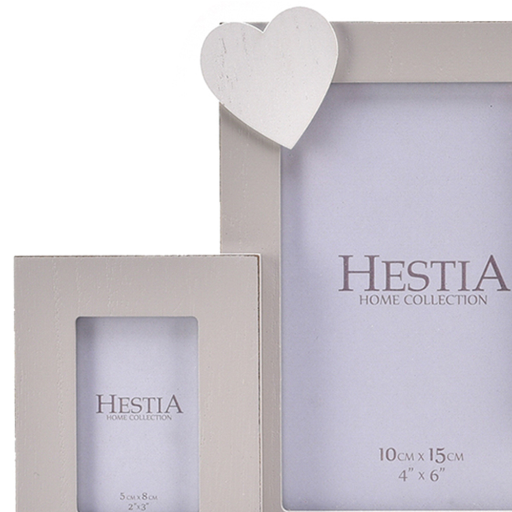 Make a personalised addition to your home decor with Premier Housewares Hestia Family Multi Aperture Frame. Featuring a distressed edge grey wooden frame and a white wooden heart - it can be perfectly perched on a shelf or mantel. Freestanding with a block base and metal support poles - it includes two 2 x 3 inch (6.5 x 8cm) portrait apertures and one 4 x 6 (10 x 15cm) portrait aperture.
