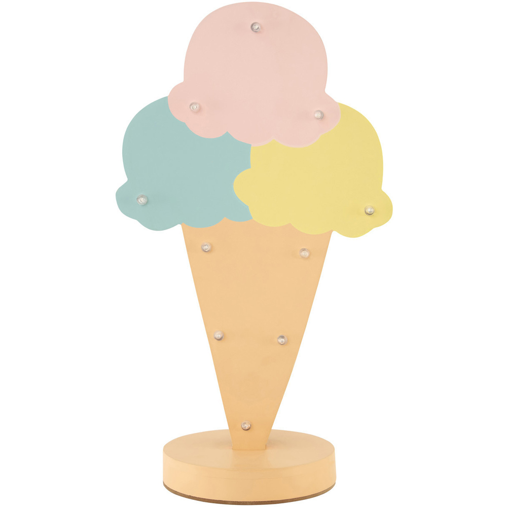 Indulge in a whimsical ambience with the Premier Housewares Ice Cream LED Light. Designed in the shape of a delightful ice cream cone, this light features a variety of pastel colours that are sure to add a cheerful accent to the top of a bedroom cabinet, chest, or any tabletop surface. With a stable round base that conveniently houses its batteries, this light stands firmly and securely. Ten small LED lights are arranged around the cone, illuminating its surface when lit, creating a warm and inviting glow. Perfect for adding a touch of fun and playfulness to any space, this light is a delightful addition to children's bedrooms and playrooms or as a charming accent in any room that craves a touch of sweetness. It requires 10 x LED Bulbs (Included). Please click here to find our range of lightbulbs.