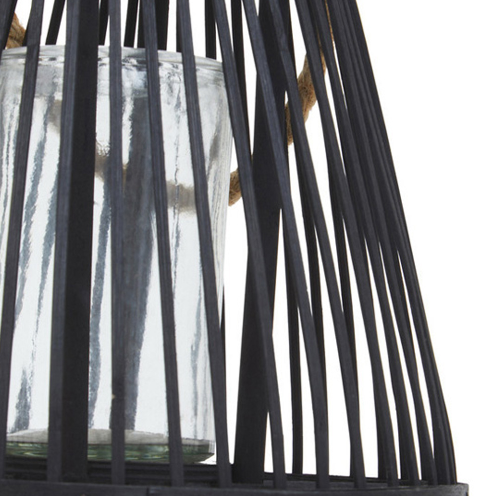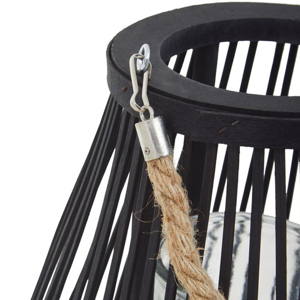 Experience candlelight's warmth and natural beauty with Premier Housewares Lentigo Small Black Bamboo Lantern. This stunning light features a sleek black finish made from sustainable rattan wireframes. It offers your favourite candle a perfect haven by enclosing a glass candle holder. It is embellished with a striking rope handle accent, heightening its rustic attractiveness and adding a bit of visual flair.