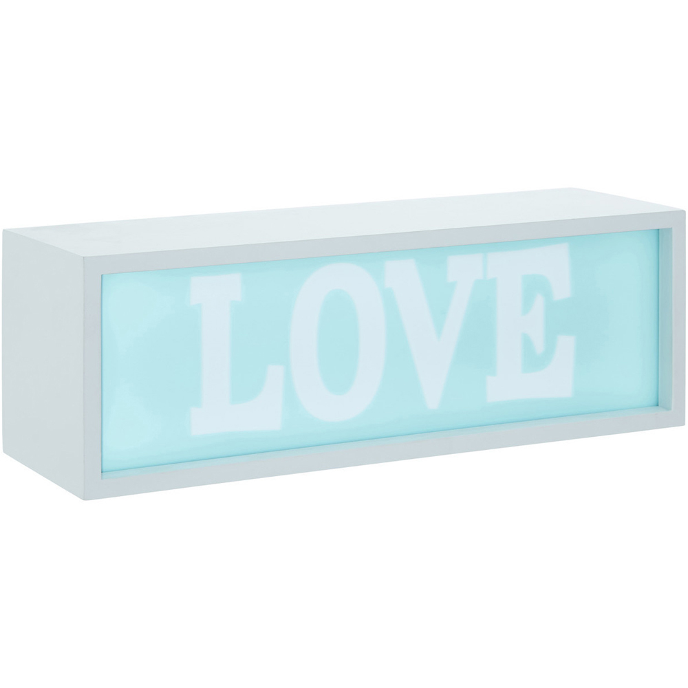 Lift your home aesthetics effortlessly with this Premier Housewares Love LED Light Box. Features a case made from durable MDF with a clean white finish that complements the translucent blue face. Large lettering spells out "Love", and when the LED is lit, it produces an ambient glow. A discreet switch at the rear turns it on and off, while a pair of strong metal hooks allow it to be displayed on a wall, a cabinet or a shelf. It requires 1 x LED Bulb (Included).