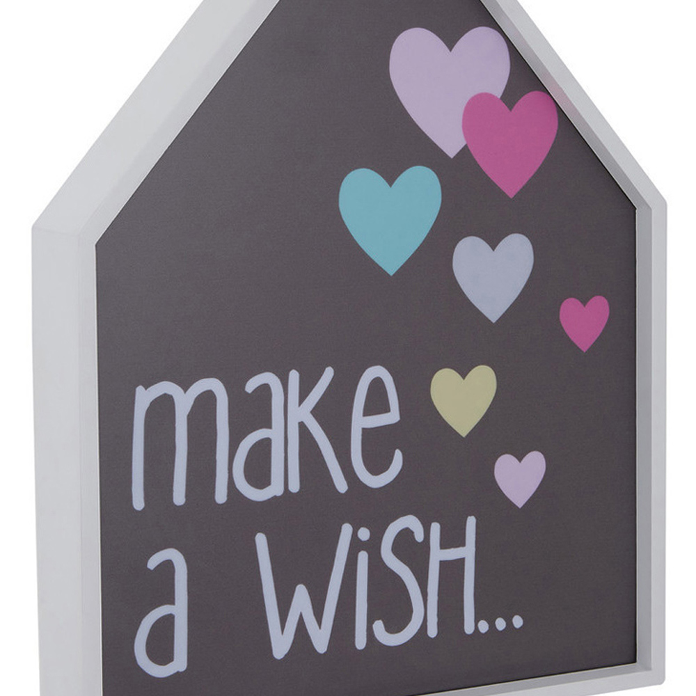 Lift your home aesthetics effortlessly with this Premier Housewares Make-A-Wish LED Light Box. Features a dark, translucent surface decorated with pastel-coloured heart motifs and the encouraging "make a wish" message is ideal for spreading positive vibes in a playroom or bedroom. The box creates an ambient glow, and its white frame forms the shape of a house. Display it on a shelf or hang it on the wall with a strong metal hook at the rear. It requires 1 x LED Bulb (Included). Please click here to find our range of lightbulbs.