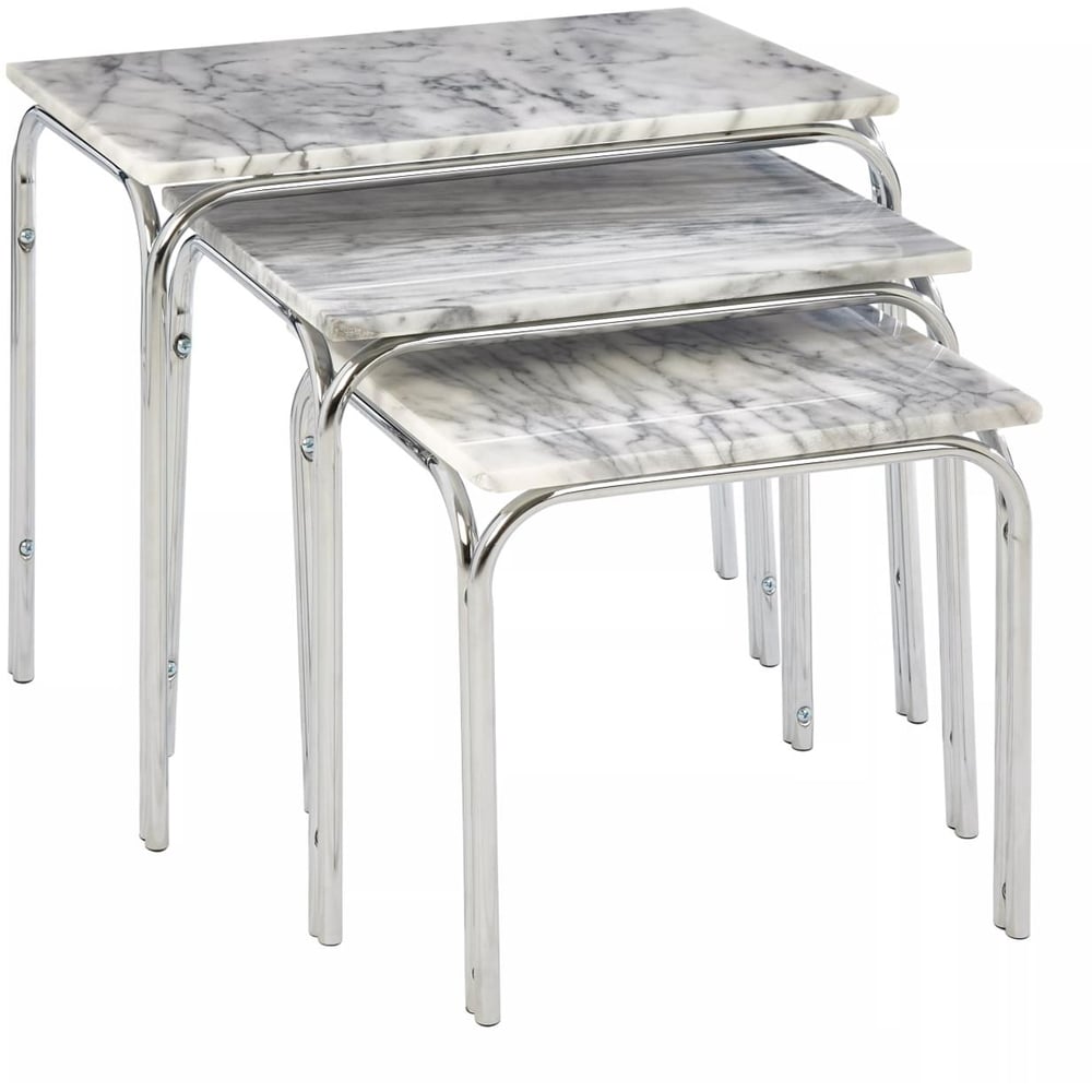 Elevate your living space with the Premier Housewares Chrome Nest of Tables Set of 3. These tables boast an exquisite white marble top adorned with elegant dark grey veins, lending a sense of dimension to their contemporary aesthetic. Ensuring steadfastness, each table top is securely placed within a sturdy chrome metal frame. This set is a testament to sophistication and functionality, offering a stylish addition to any space.