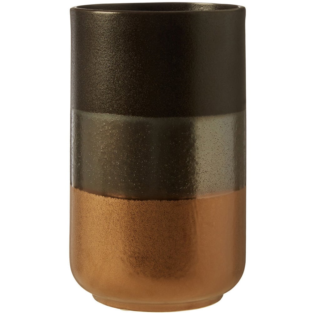 Transform your home into a style gallery with Premier Housewares Nixon Stoneware Vase. This sleek ceramic vase features three stripes painted in different colours. The matte black top contrasts with the metallic palette, while the copper finish at the bottom softens the darker gunmetal tone. Also, it elevates any space with its seamless blend of textures and hues.