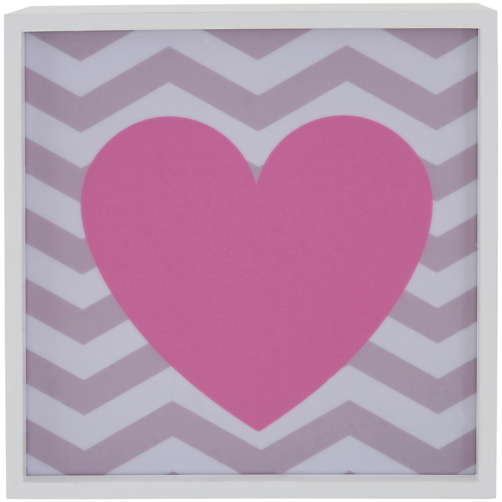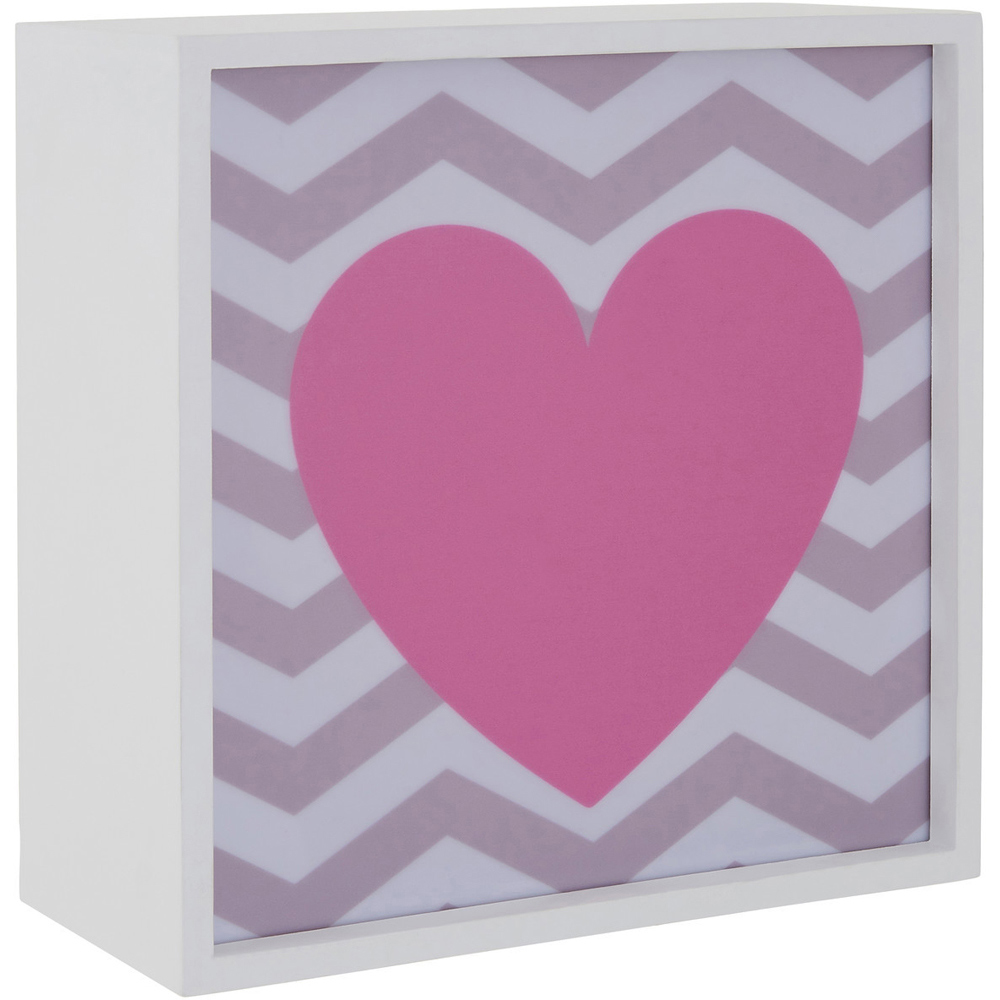 Lift your home aesthetics effortlessly with this Premier Housewares Pink Heart LED Light Box. Features a translucent surface decorated with a chevron pattern that becomes more prominent when the box is lit. A large pink heart is positioned over the pattern, adding to its decorative appeal. With a pair of metal hooks on its rear, this LED light box can be easily mounted on the wall, on a shelf or bedside cabinet. It requires 1 x LED Bulb (Included). Please click here to find our range of lightbulbs.