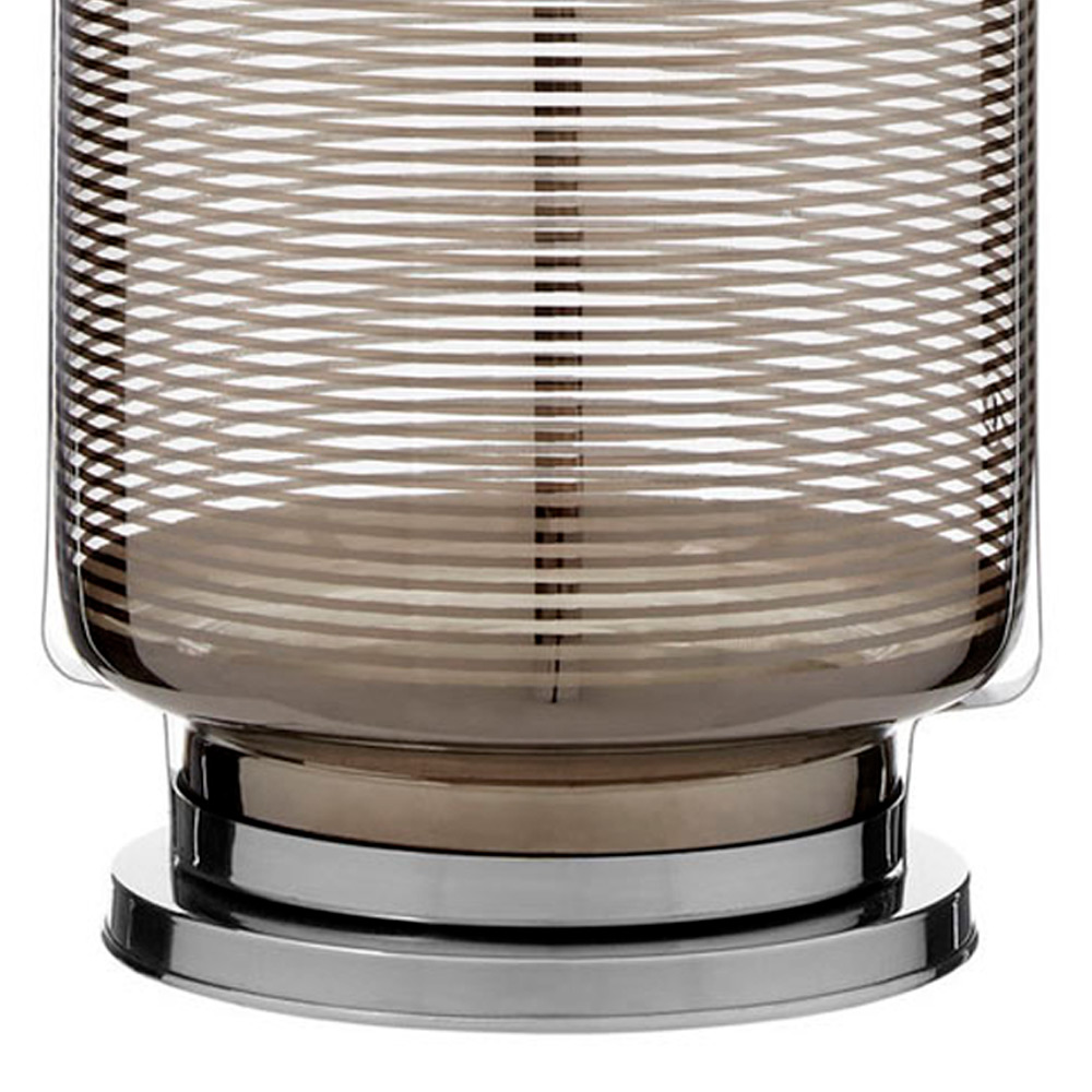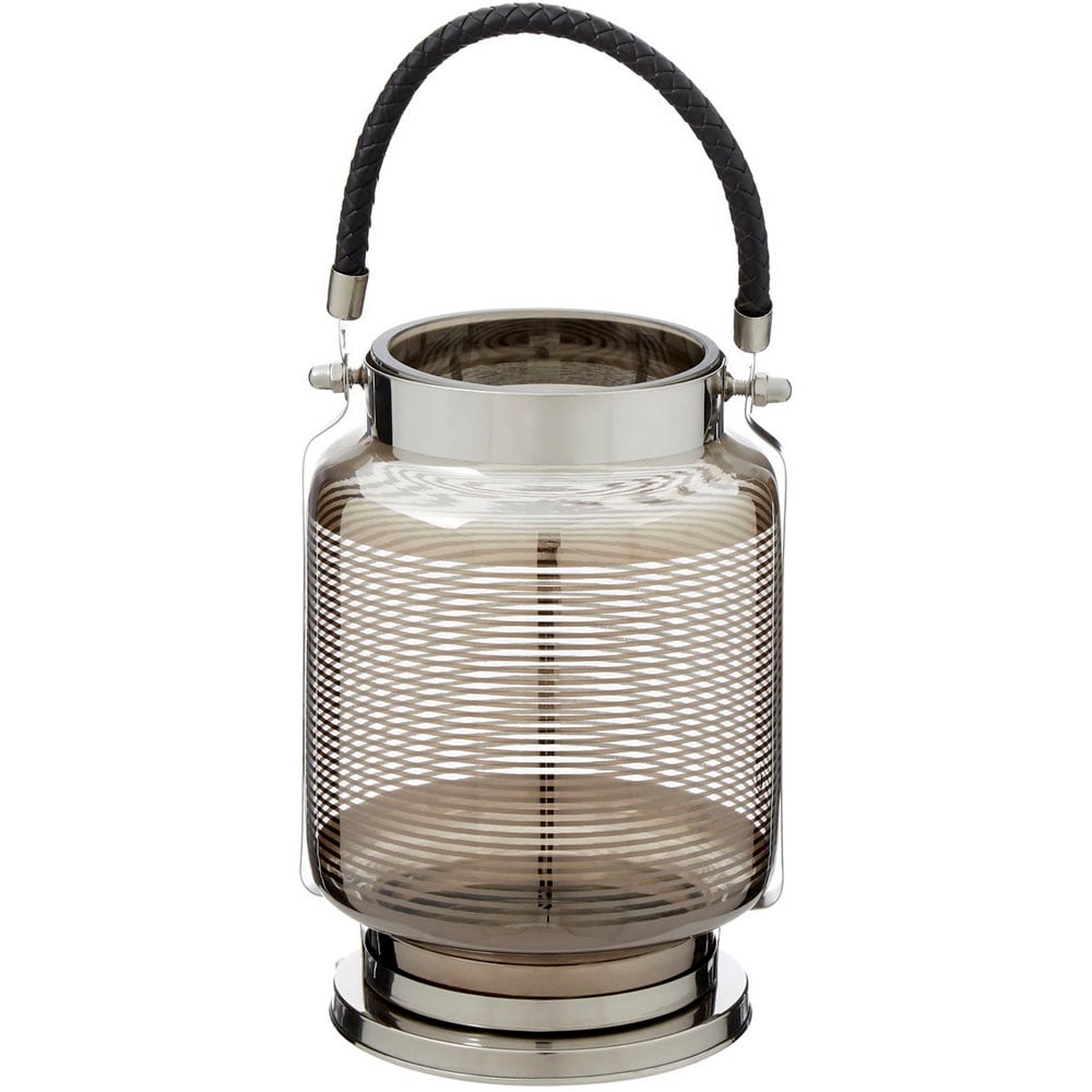 The Raya Small Nickel Stripe Lantern from Premier Housewares is just the thing you need to add an illuminating touch to your decor. The glass shade features a nickel stripe design that has a reflective stainless steel base and clasps. Its twined carry handle is made from black faux leather.