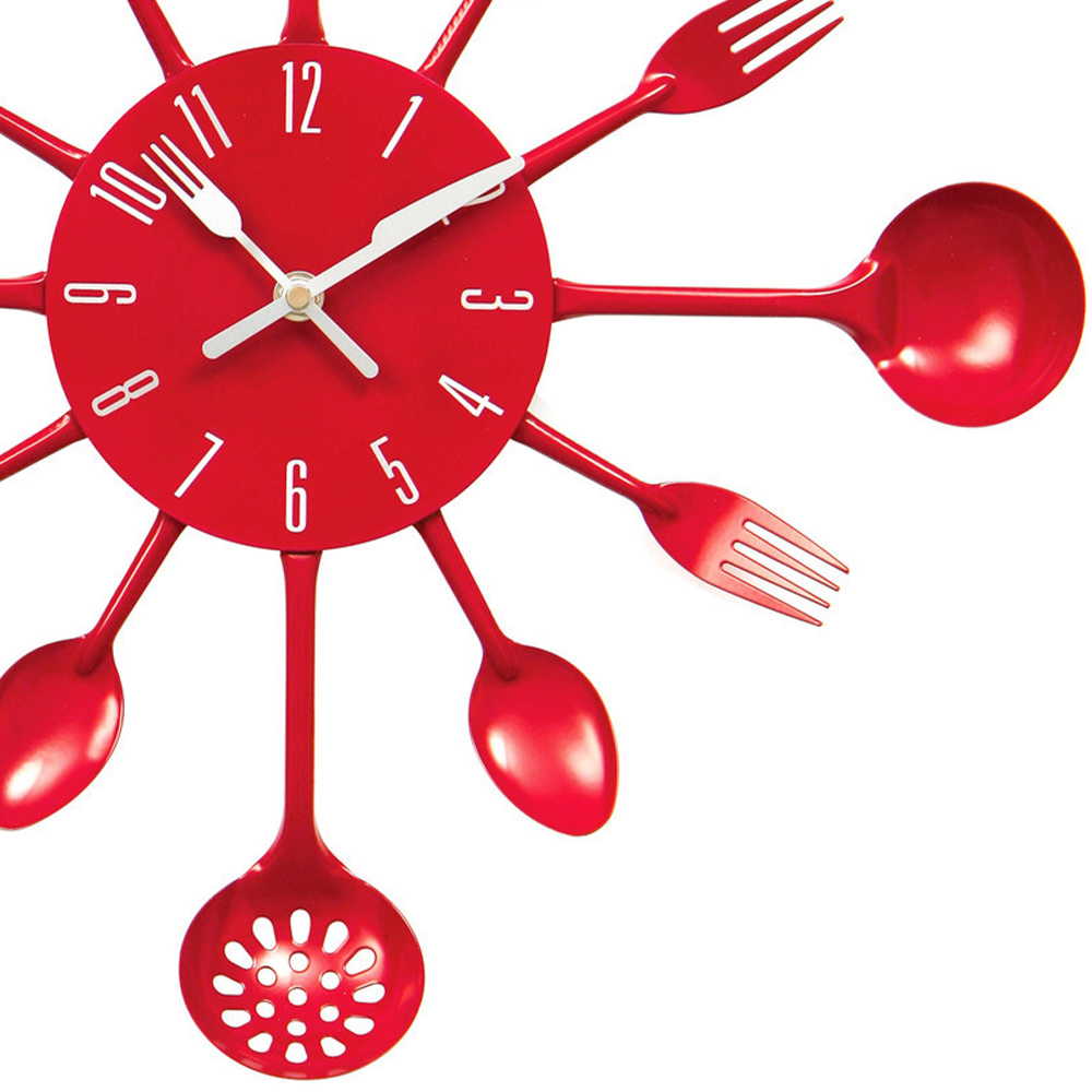 Add a fun and funky touch to your kitchen decor with Premier Housewares Red Cutlery Metal Wall Clock 43cm. This durable metal clock features a round face with kitchen utensils or cutlery pieces representing numbers. Plus, the culinary theme extends to knife and fork hands, with metallic silver colour contrasting with a bright red finish.