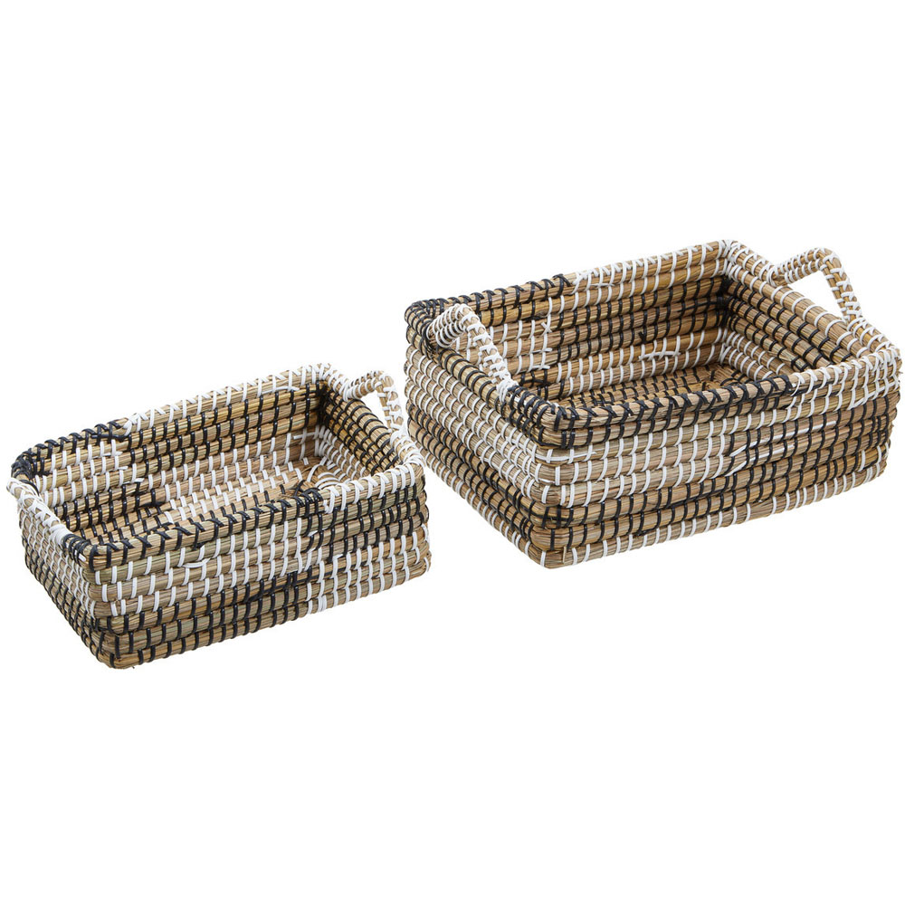 Store all your things and keep them organised with this set of two Premier Housewares Straw Baskets. Skilfully handwoven from natural straw, this set of two rectangular baskets has dual handles forming a pointed design. Each basket has raised sides rolled with a series of black and white twisted seagrass detail.