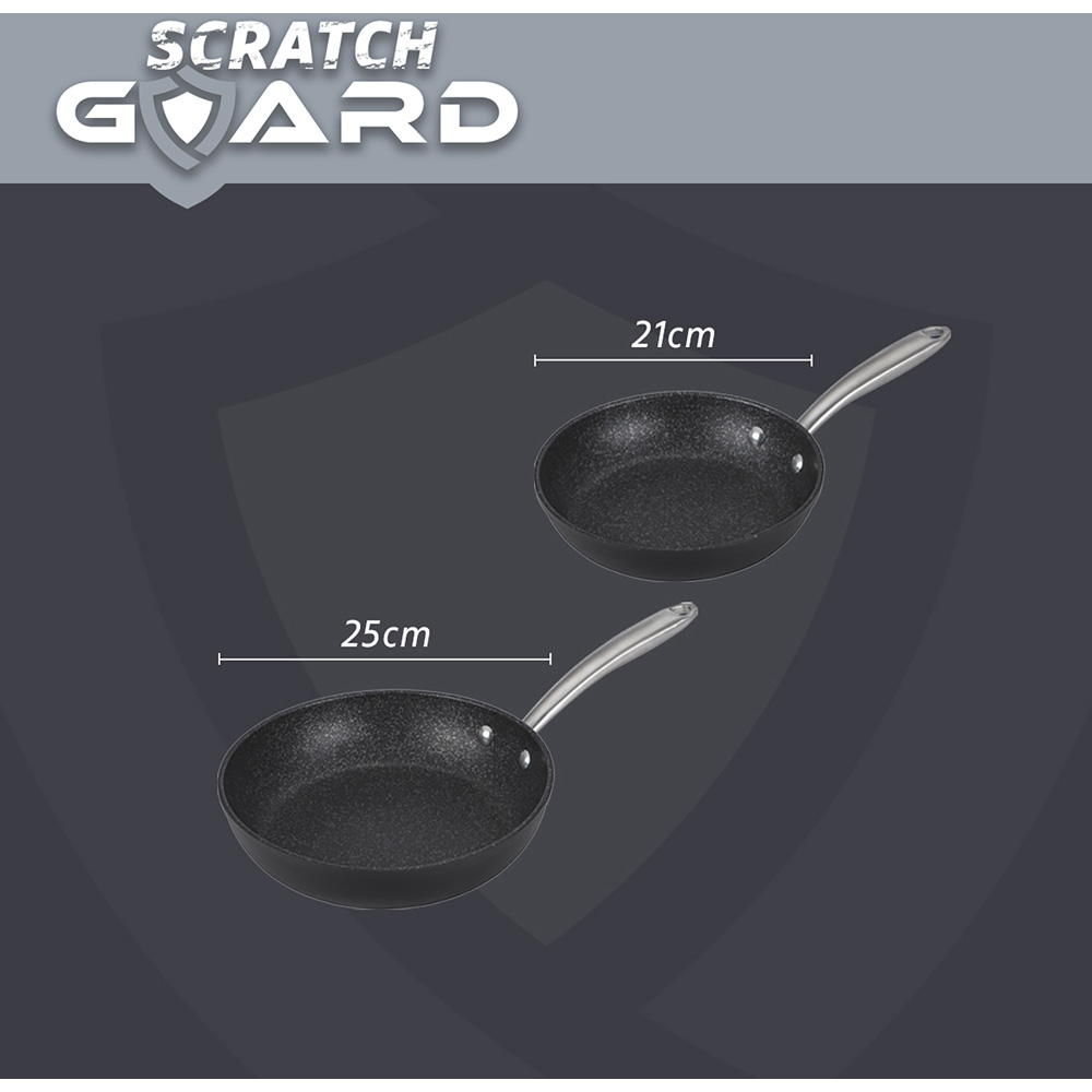 Prepare delicious meals effortlessly with the Prestige 2 Piece Scratch Guard Aluminium Frying Pan Set. This set features a sturdy ceramic exterior for durability and easy cleaning. It includes a 21cm and 25cm frying pan, both equipped with a super thick base for quick and even heat distribution. The dimpled non-stick surface is highly resilient and scratch-resistant, making cooking stress-free. Moreover, these pans are dishwasher and oven safe up to 260 degrees Celsius, 500 degrees Fahrenheit, and Gas Mark 10. Backed by a 10-year guarantee, you can trust in the quality and longevity of this set.