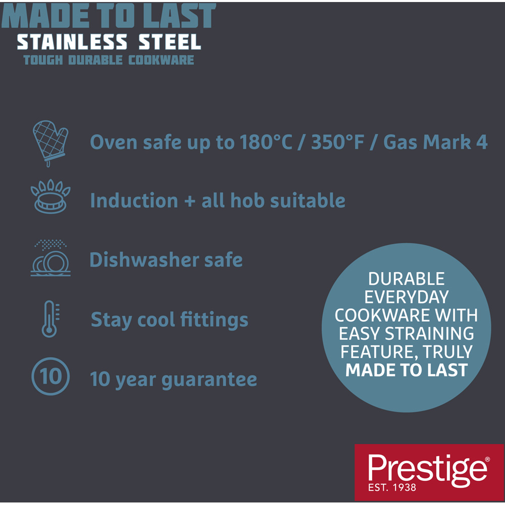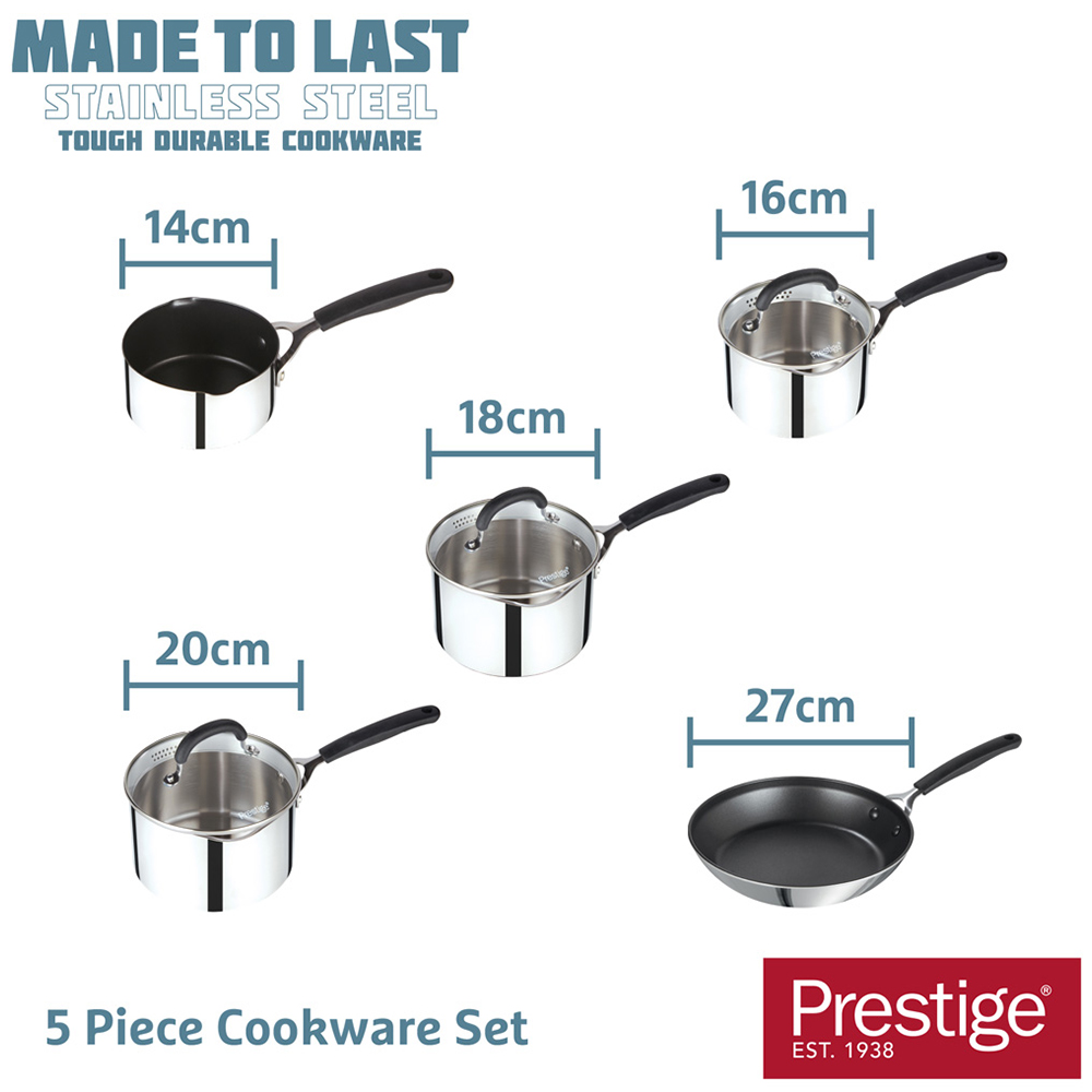 Introducing the Prestige 5 Piece Stainless Steel Cookware Set, designed to meet all your cooking needs. This set includes a 27cm non stick frying pan, 14cm non stick milk pan with pouring lip, and a set of three saucepans with straining lids (16, 18 and 20cm). The scratch resistant non-stick surface on the milk pan and frying pan ensures durability and easy cleaning. With an encapsulated steel base, these saucepans are suitable for induction and all hob types, providing fast and even heat distribution. The saucepans come with double sided straining lids for easy pouring and an internal measurement scale. Dishwasher and oven safe up to 180 degree Celsius, these pans are perfect for everyday use. Built to last, this cookware set is a must-have in any kitchen.