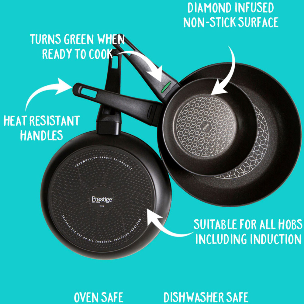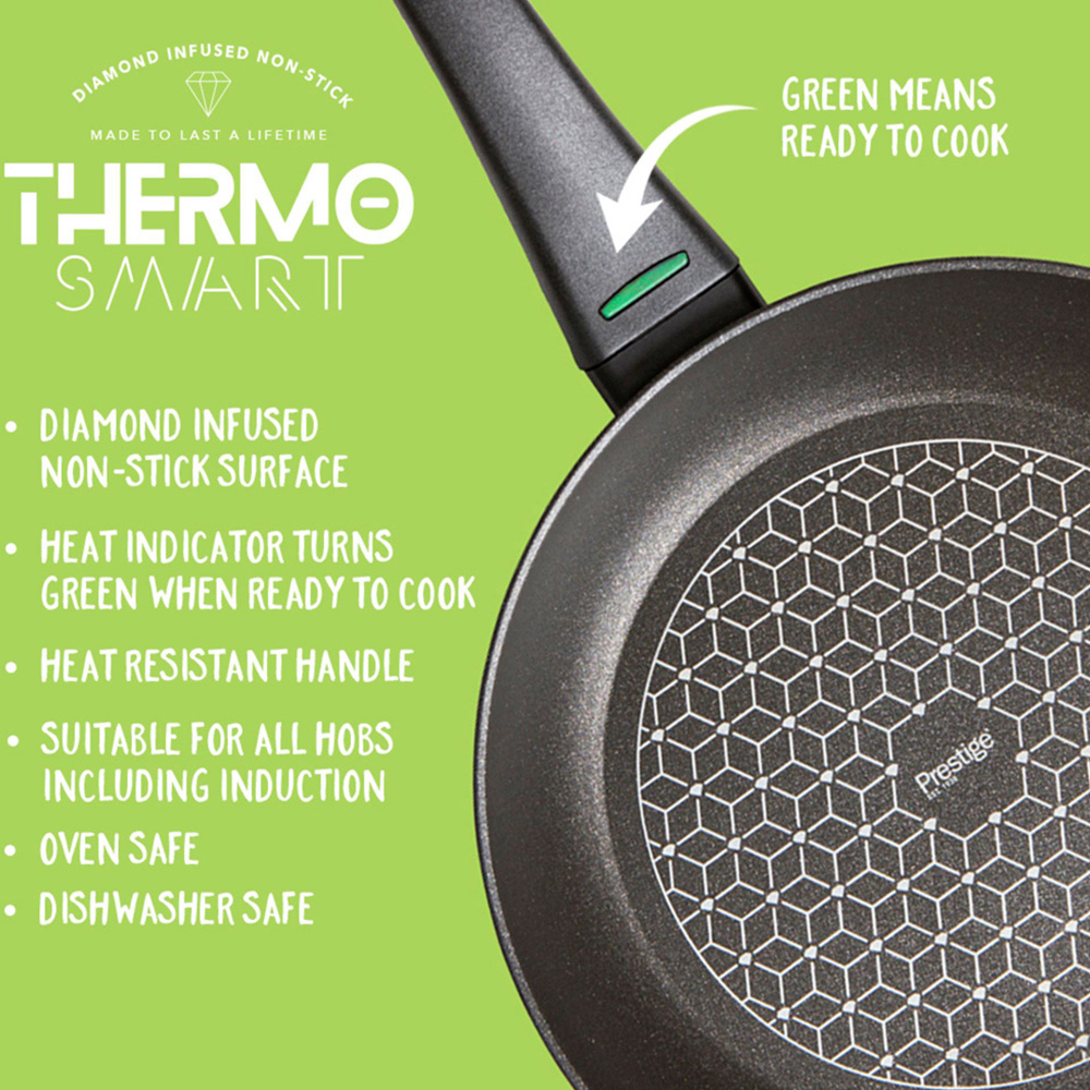 Introducing the Prestige Thermo Smart 3-Piece Aluminium Saucepan Set! Have you ever imagined a pan that could notify you when it's ready to cook? Well, wonder no more. This innovative Thermo Smart range does just that! With a heat indicator on the handle that turns green when the pan reaches the perfect cooking temperature, you can say goodbye to guesswork and save valuable time in the kitchen. The non-stick surface, reinforced with diamond dust, ensures excellent food release every time. Rest assured, this range comes with a 5-year guarantee and is dishwasher safe for effortless cleaning. Suitable for all hobs, including induction, these pans are designed for ease of use. The heat indicator in the handle changes from black to green, indicating when the pan is ready to cook your ingredients. Crafted from high-quality aluminium, these pans are not only durable and lightweight but also exceptional heat conductors. We are so confident in their quality that we offer a 5-year guarantee. This 3-piece set includes 16, 18, and 20cm non-stick saucepans that are induction and oven-safe, making them perfect for family cooking. Whether you use them on an induction hob, other cookers, or even in the oven (up to 180 degrees Celsius / Gas mark 4), these pans offer 100% versatility and flexibility. They are tough, practical, and easy to clean, making them a perfect addition to every kitchen.
