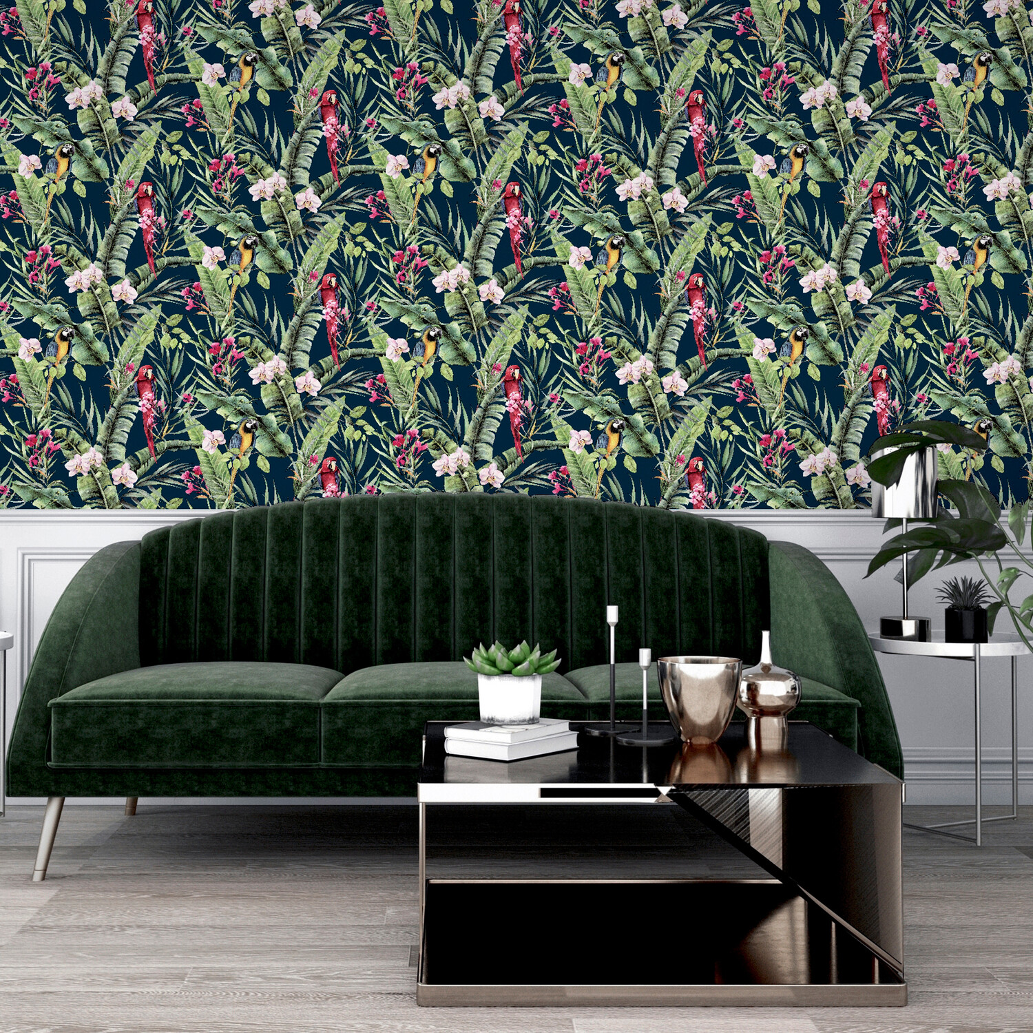 Create a bold statement with this stunning tropical Pretty Polly Peelable Wallpaper. Featuring a deep navy background, the vibrant botanical prints, florals, and exotic animals bring an eye-catching, jungle-inspired look to your space. Roll Length: 10.05m