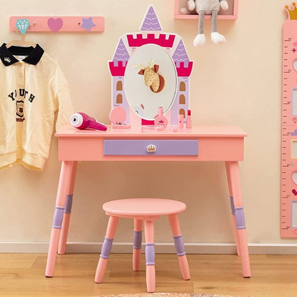 Transform your child's room into a magical castle with this Costway Single Drawer Kids Princess Dressing Table and Stool Set with Mirror. Featuring a removable silver mirror, this versatile piece can switch from a makeup vanity to a practical writing desk in a few moments, making it ideal for both play and study. The set is beautifully crafted from high-quality MDF with sturdy natural wood legs, ensuring durability and stability. A large drawer provides ample storage for beauty accessories or stationery, while the blunted edges and burr-free surface ensure a safe play environment. With its delightful pink castle theme, this vanity set is sure to capture the heart of your little princess, making it an excellent gift choice.