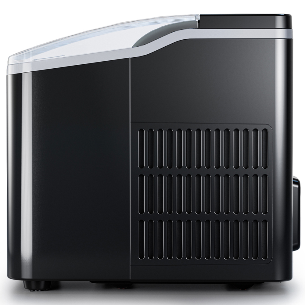 Get chilled drinks with the Pro Breeze PB-IM01B-UK Black Countertop Ice Cube Maker 2L. This self-cleaning machine churns out 15kg of ice daily in just six to nine minutes. Just lift the lid, fill the water reservoir, and watch as fresh ice fills the internal removable basket, ready for immediate use. The 2L water tank keeps the production uninterrupted, yielding bullet-shaped ice cubes that melt slower, preserving the flavour of your drinks. Its 250-second self-cleaning function guarantees hassle-free maintenance. The two ice cube sizes allow you to choose between small (7 grams) and large (9 grams). It helps you create the perfect cocktails and cold drinks or ice bottles and preserve frozen food. This creative machine creates bullet-shaped ice cubes that melt slower and have a soft texture to chew, ensuring to never ruin the taste of your drink. The sleek design and neutral colourway ensure the machine will look great in any kitchen, bar, camper van or office.