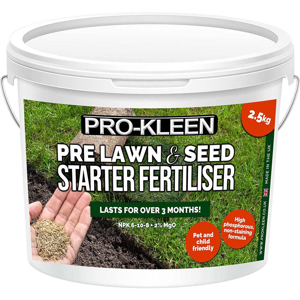 Pro-Kleen 4-in-1 lawn fertiliser has been specially formulated with nitrogen, phosphorous, potassium and added 2% magnesium oxide. This formula has low levels of fast and slow-release nitrogen that encourage strong shoots to develop, making sure your lawn grows robust and healthy. Phosphorous encourages strong root development so that each blade of grass grows thick and healthy. Potassium is a key ingredient in preventing lawn disease and keeping your lawn healthy during the cold autumn and winter. Magnesium is an essential element of plant growth, although it is often missing in other lawn fertilisers. It helps to keep chlorophyll levels high, which prevents poor and stunted plant growth. This lawn feed contains no harsh chemicals, meaning that children and pets can be reintroduced to the area after application. The lawn granules are also non-staining and won’t leave any brown stains on your decking, patios or driveways, so you can use them with complete peace of mind. Pro-Kleen’s Pre-Lawn and Seed Starter Fertiliser helps to boost root development so that your grass gets the best start possible. It lasts up to three months after application to make sure your grass grows strong, healthy and vibrant! These 2.5kg tubs can cover up to 70m2-100m2. Application Rate: 25-35 g/m². Apply 3-5 days before seeding or laying turf or up to 6 weeks afterwards. You can apply Pro-Kleen’s Pre-Lawn and Seed Starter Fertiliser by hand or by using a garden spreader. For best results, keep the area well-watered after laying turf or sowing lawn seed.