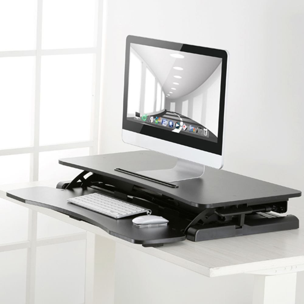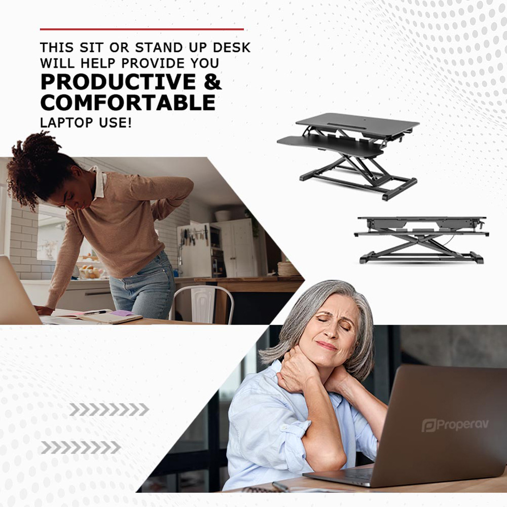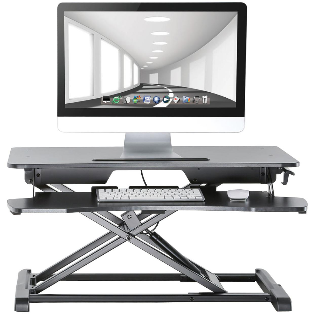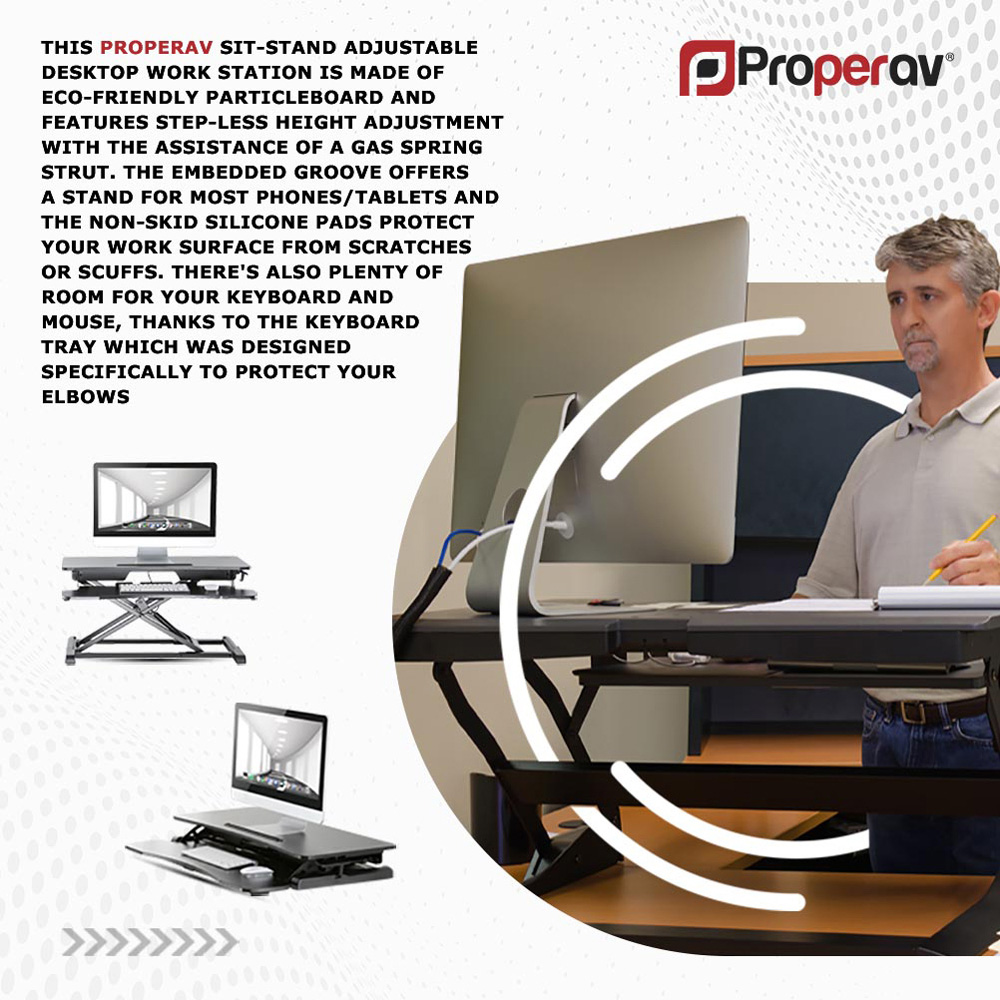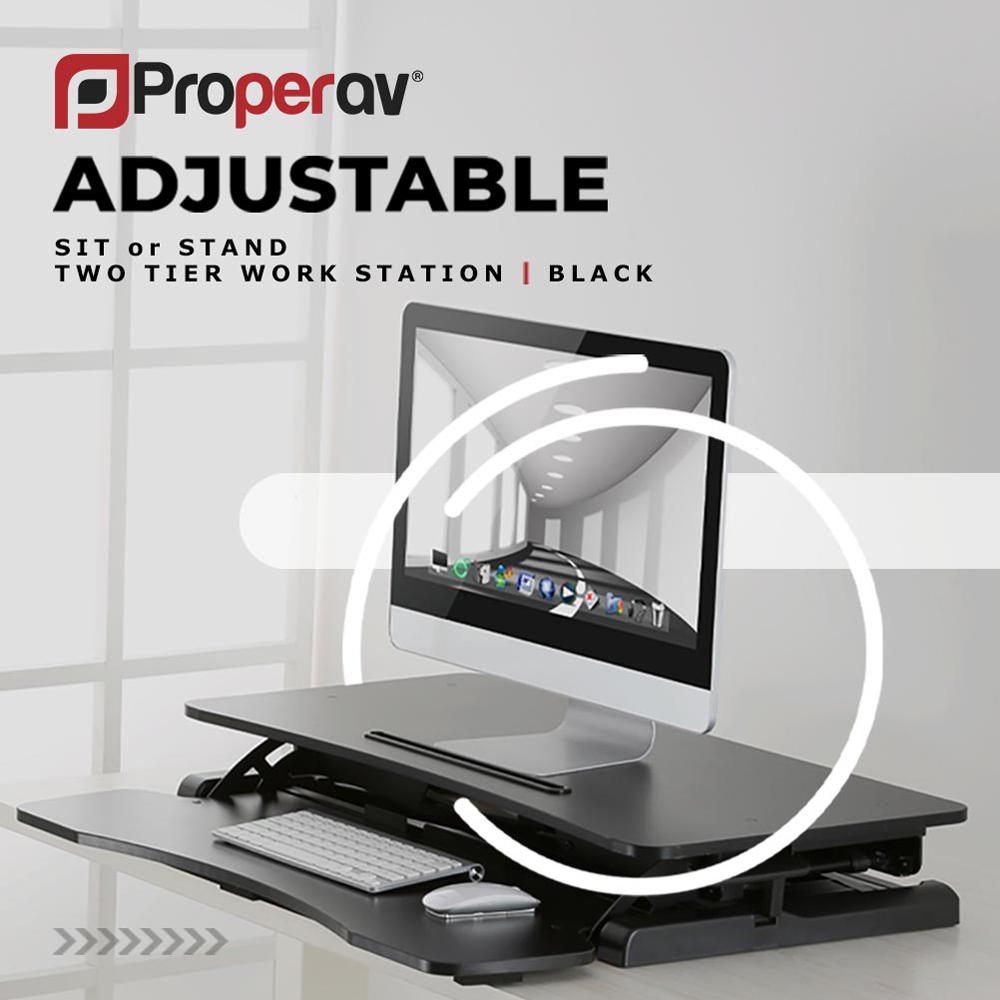 Enhance your productivity and comfort with the ProperAV Two Tier Gaming Desk Black. Equipped with a step-less height adjustment with the assistance of a gas spring strut, it is made using eco-friendly particleboard. The two-tier design offers ample space for a comfortable work environment. The embedded groove offers a convenient stand for phones and tablets. Non-skid silicone pads protect the surface from scratches, ensuring that it stays in pristine condition. It is practical and easy to operate.