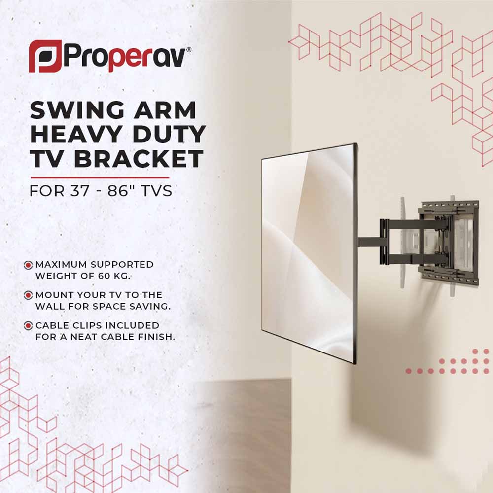 With a sturdy construction, the ProperAV Swing Arm Heavy Duty TV Wall Bracket supports a wide range of TV sizes between 37- 86 inch. The TV is held securely and the bracket offers smooth, full-motion capabilities including tilt and swivel to put the TV in the ideal position. Perfect for living rooms, bedrooms, offices, and more.