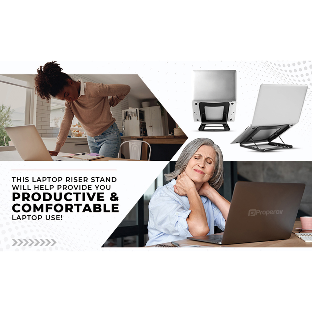 This ProperAV Adjustable Laptop Stand in silver has a simple but classic design and is lightweight and portable. Easy to carry in a laptop bag, it adds extra functionality to working on your laptop at home in the office or workspace. The five variable height position is particularly useful when using your laptop as a second screen and the maximum height position on this stand has been engineered to allow you to have your laptop screen in an almost vertical position. Suitable for all size laptops, it will make a fine addition to your sturdy or work desk.