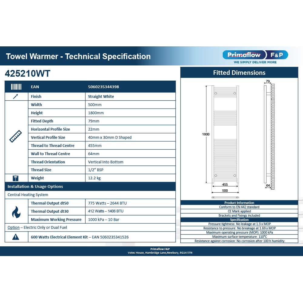 The Prorad 2 Towel Rail in a straight 500x1800mm white finish offers a practical and stylish solution for any bathroom. Its generous size provides ample space for warming multiple towels, adding a touch of luxury to your daily routine. The clean, white finish complements a variety of bathroom decors, while the straight design offers a classic and versatile aesthetic. Beyond its aesthetic appeal, this towel rail efficiently heats towels, ensuring they are warm and dry when you need them. Prorad is a reputable brand known for producing quality heating solutions, and this towel rail is no exception. It's designed for easy installation and can be integrated into most standard heating systems. Whether you're looking for functionality, style, or both, the Prorad 2 Towel Rail is a worthwhile consideration for enhancing your bathroom experience.