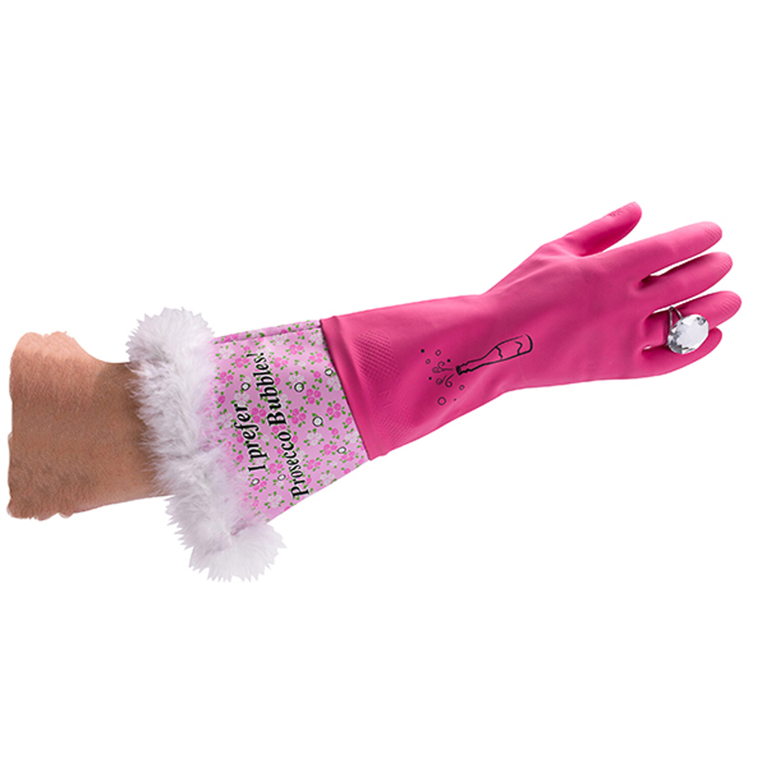 Add a touch of fun to your cleaning routine with the Prosecco Bubbles Washing Up Gloves. These functional washing-up gloves protect your hands while washing up and come with a bling ring for a playful twist. They also feature a faux fur trim, adding a dash of glamour to your everyday chores.