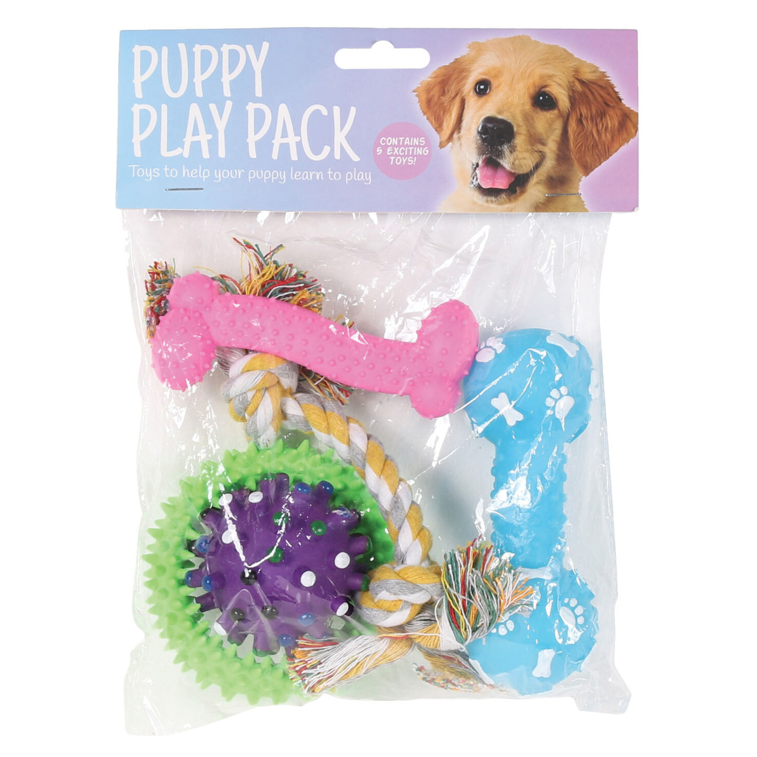 This Puppy Play Pack is a great pack of toys, no matter what your pup is into, there will be something here to keep them occupied for hours! This great value pack includes a ball, dumbbell, ring, rope, and bone, with a variety of textures to stimulate your pup and keep them interested and happy. Ideal for teething and development, any puppy is sure to be excited by this collection.