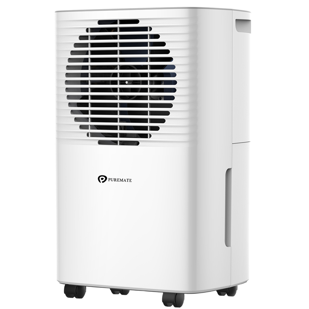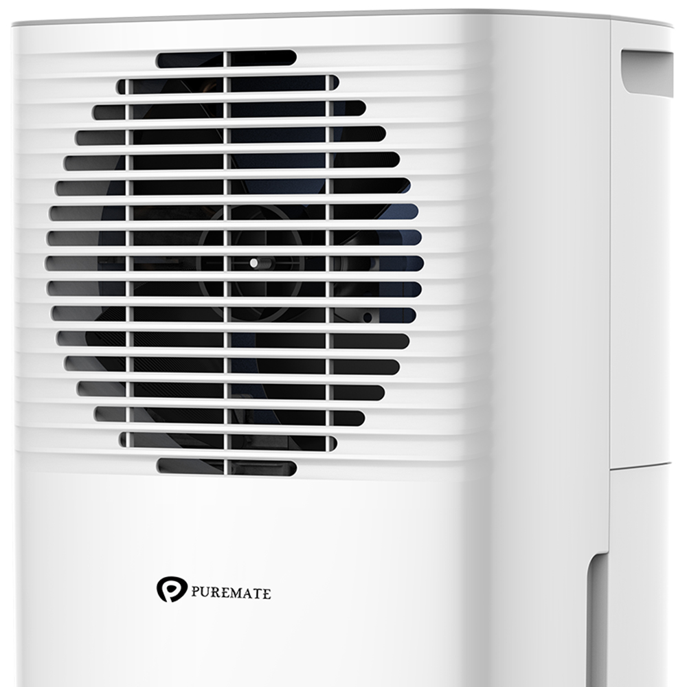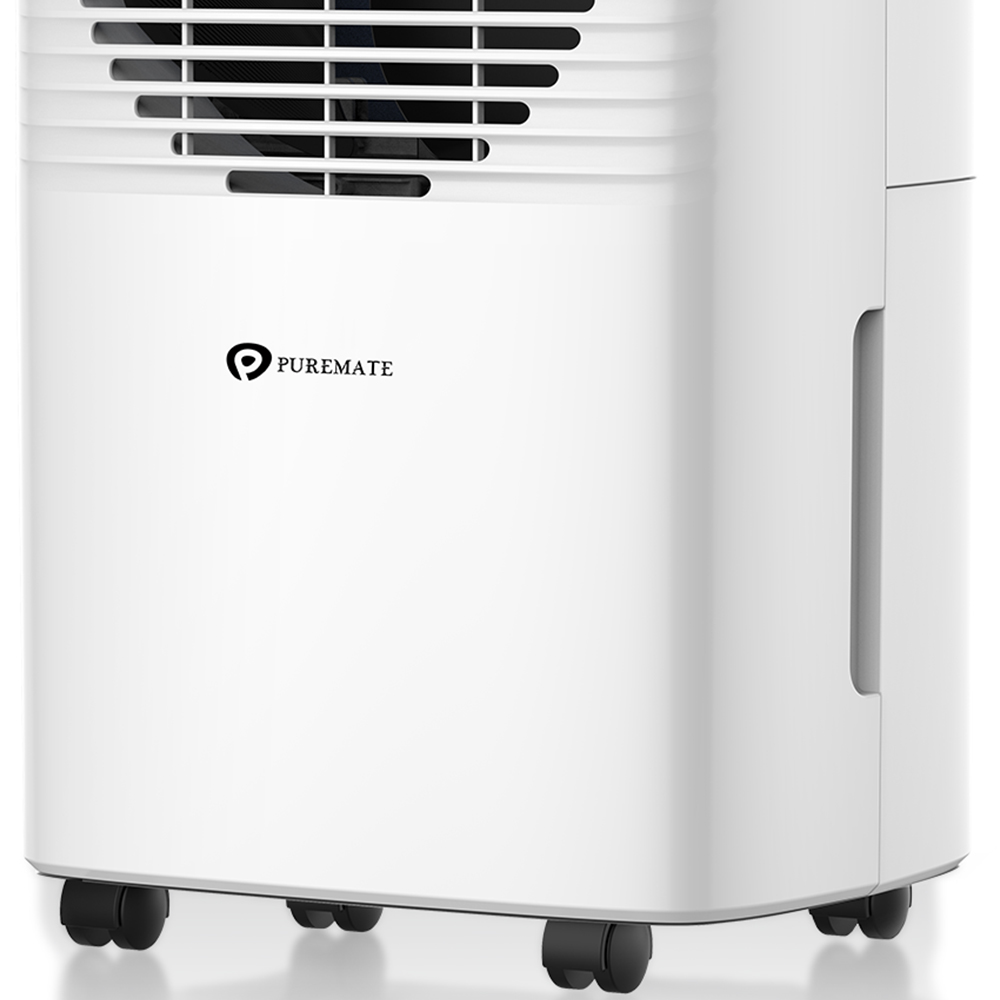 Eliminate excess moisture and humidity with the PureMate White Dehumidifier with continuous drainage. It is a portable dehumidifier that can remove up to 10 litres of moisture per day. This dehumidifier is designed to create a healthier and more comfortable environment in your home by removing excess moisture and humidity that can lead to the growth of allergens and damage to your furniture. With its durable caster wheels and compact design, you can easily move it from one room to another. It's important to note that the amount of water the unit will draw depends on factors such as room size, temperature, and humidity. Featuring intuitive touch button controls and a clear LCD screen, it allows you to easily control the humidity level inside the room. It also includes a 24-hour timer function, two fan speeds for customised use, and a 2L removable water tank capacity.