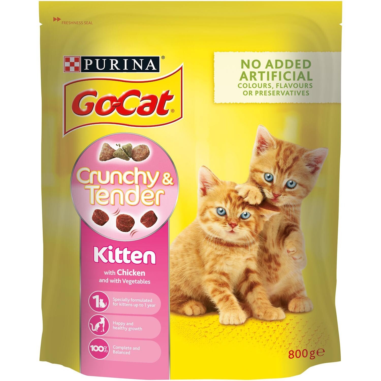 Go Cat Crunchy and Tender Kitten Food is a delicious kitten food specially formulated for their healthy development for up to 1 year. It offers a combination of delicious crunchy pieces and softer, more tender chunks for your kitten's enjoyment at mealtimes. Go-Cat provides your kitten with all the nutrition they need and the great taste they love, to help keep them healthy and happy. This product is also suitable for pregnant or lactating cats. All our recipes have no artificial colourants, flavourings or preservatives.