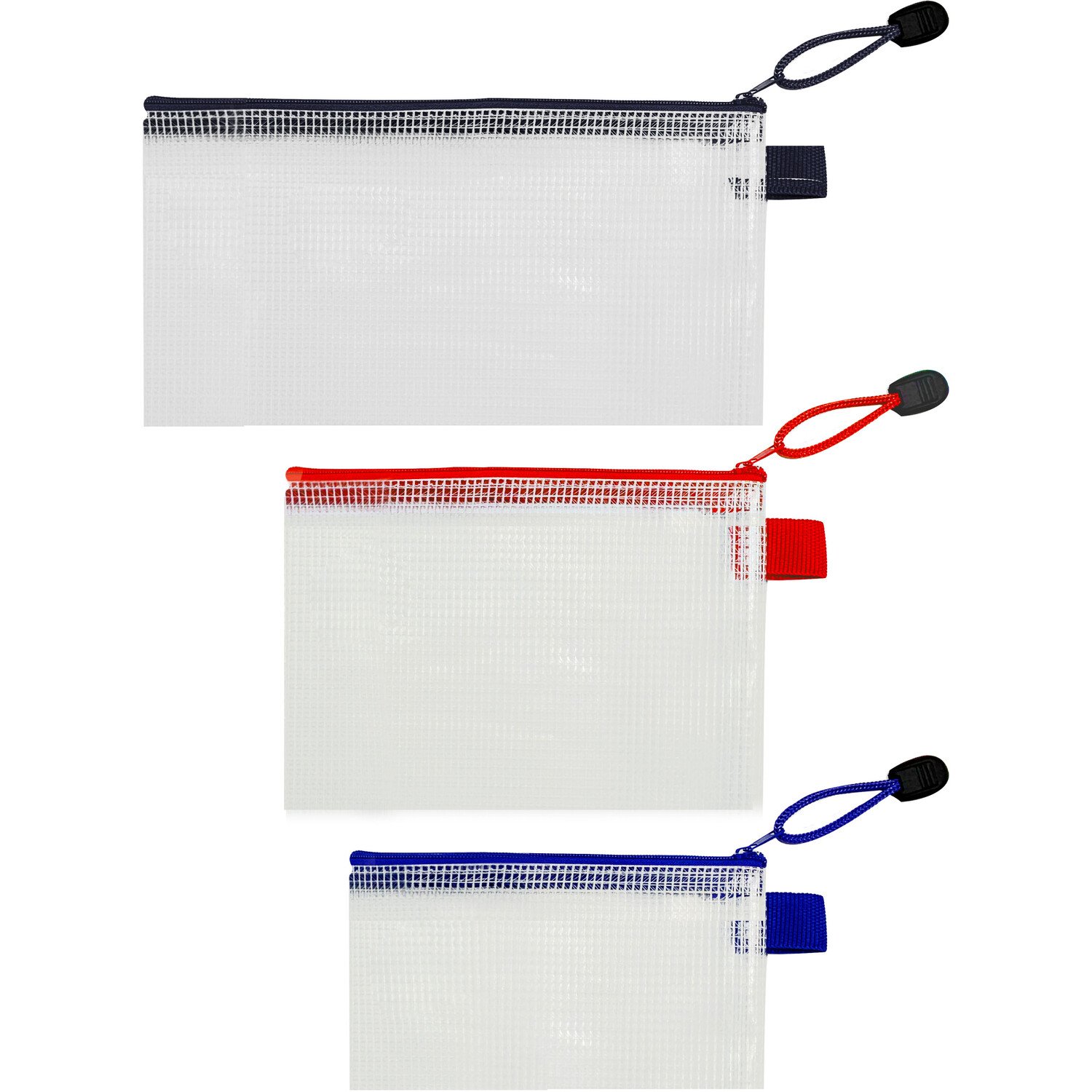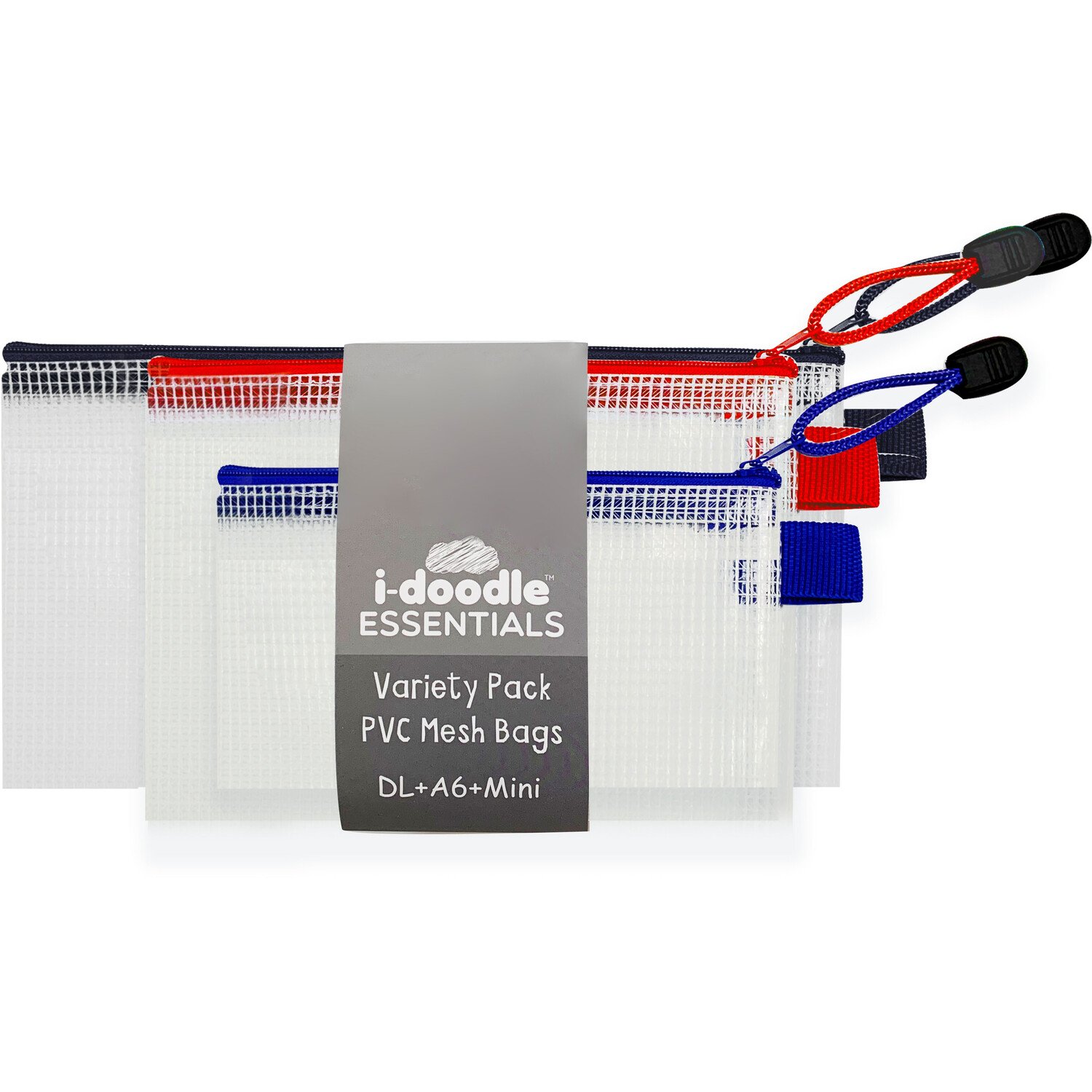 This Pack of Three PVC Mesh Bags is perfect for storing and organising stationery, receipts, letters, photographs and more. With three different sizes included with different coloured zips, all made from strong and durable PVC material.