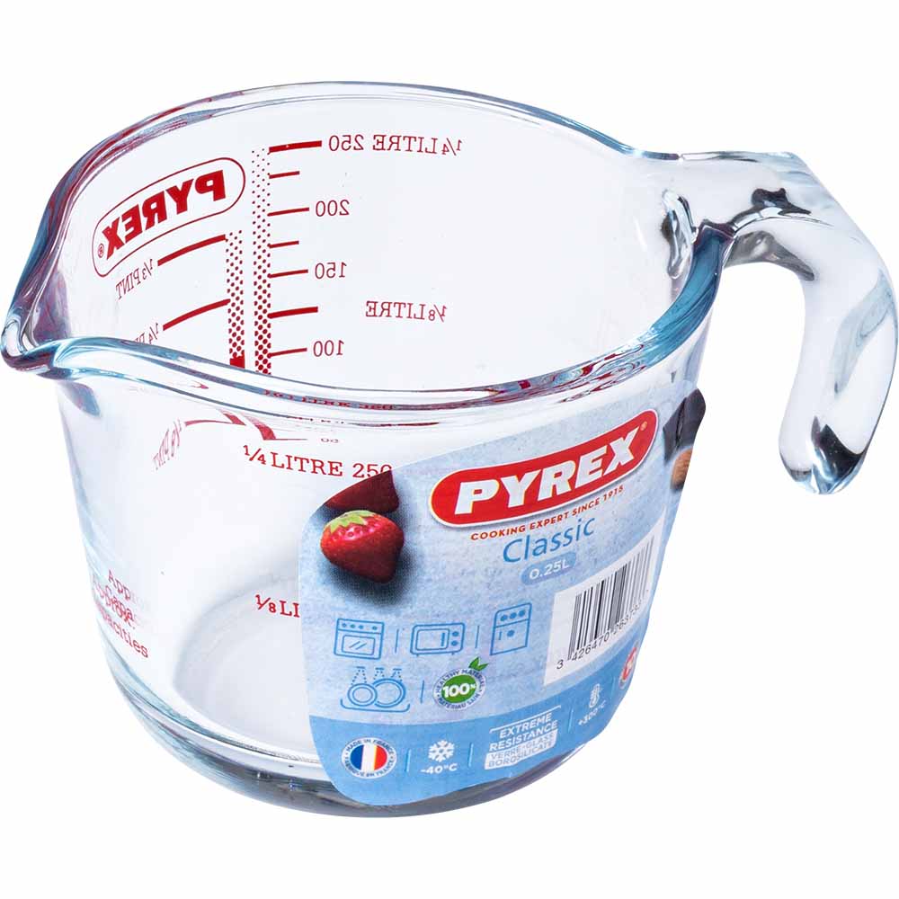 Whether its baking or storing, this Pyrex classic measuring jug offers a perfect solution to all your cooking requirements. It is heat resistant and made from borosilicate glassware. This 0.25L measuring jug is perfect for small amounts of liquids. The jug is suitable for microwave, oven use and can also be used to store ingredients in the fridge or freezer. As glass is a non-porous material, no food flavours are absorbed, meaning the jug can be used for both sweet and savoury dishes with no risk of flavour transference. All Pyrex glass products are oven safe up to 300°C and can go in the freezer to -40°C. They have a thermal shock resistance up to 220°C and come with a 10 year guarantee, making your life convenient.
