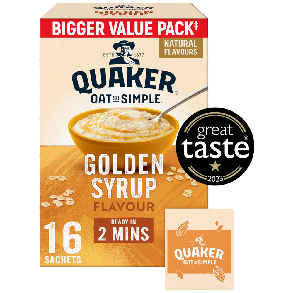 - 16 Delicious Quaker Oat So Simple Original Porridge Sachets. - For Over 140 Years, The Humble Oat Has Inspired Quaker To Make Delicious Porridge, Cereal, Granola And More - The Creamy Goodness Of 100% British Wholegrain Oats, Mingling With The Irresistable Flavour Of Golden Syrup - Guarenteed To Get Your Mouth Watering. - Perfect Porridge In Just 2 Minutes, Quaker Oat So Simple Microwaveable Oats Are A Great Morning Time-Saver - In A Rush? Slip A Sachet Into Your Bag And Enjoy At The Office. Simple. - Only Natural Flavours And No Artificial Preservatives - Sustainably Grown British Oats - Helps Lower Cholesterol Through Each Serving (36G) Containing 35% Of The 3G Of Oat Beta-Glucan Suggested Per Day. - Outer Packaging Is Recyclable. 100% Whole Grain. Natural Flavours. Ready In 2 Mins. Sustainably Grown British Oats. Helps Lower Cholestrol. Quaker.