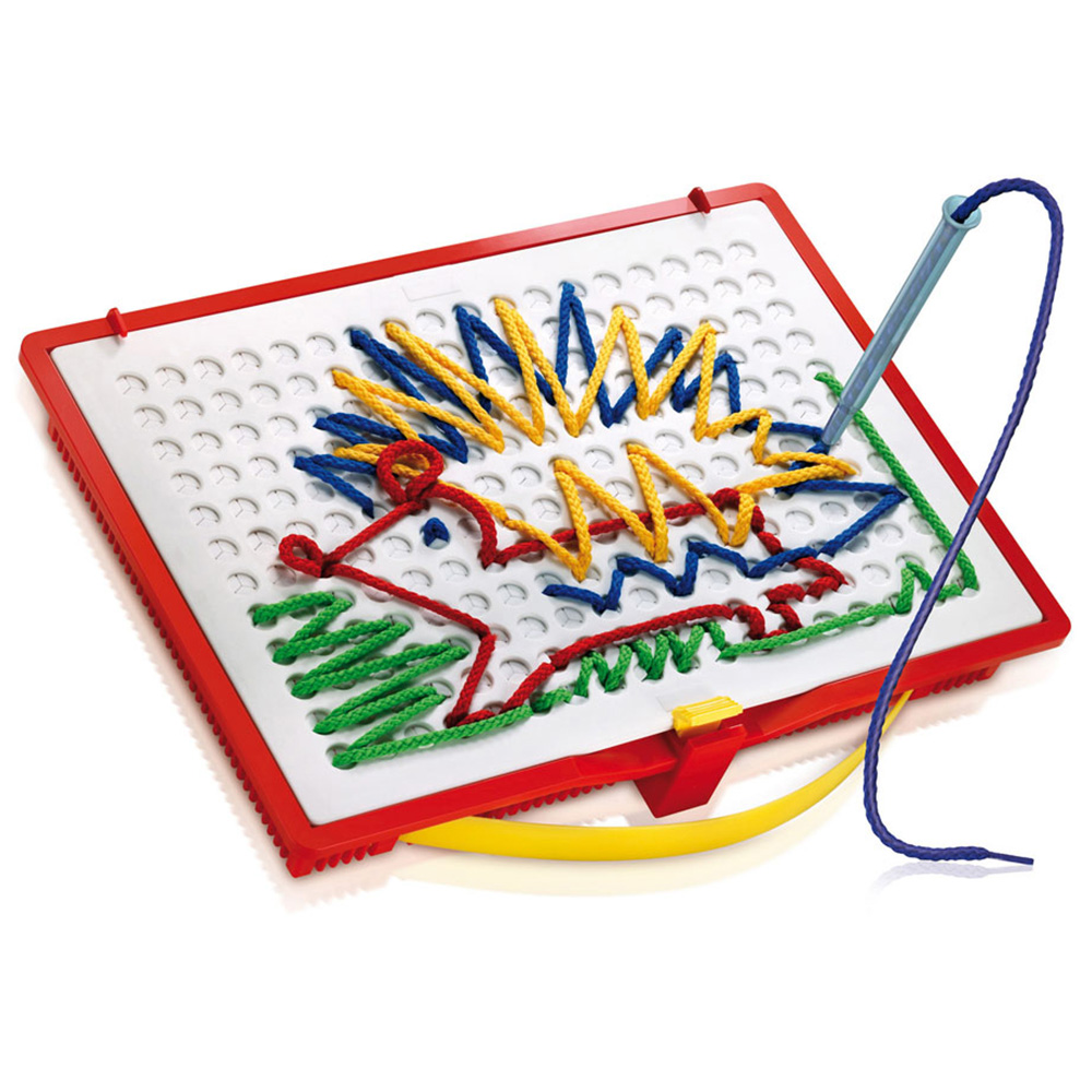 Filo Filo' is a super fun way to create beautiful multicolour designs and then undo them to start all over again. All you need to do is slide a lace into the special lacing-pen, press it into the self-locking slots on the board, and start tracing the designs you like to create some incredibly special string art. Use the included pattern cards that will provide different templates to copy with various levels of difficulty. This will exercise your imagination before you start creating your own free-style patterns. Comes with a Filo board with self-locking slots, a case with handle, 4 x lacing pens, 8 x laces, and cards with templates. Suits ages 3 years +.