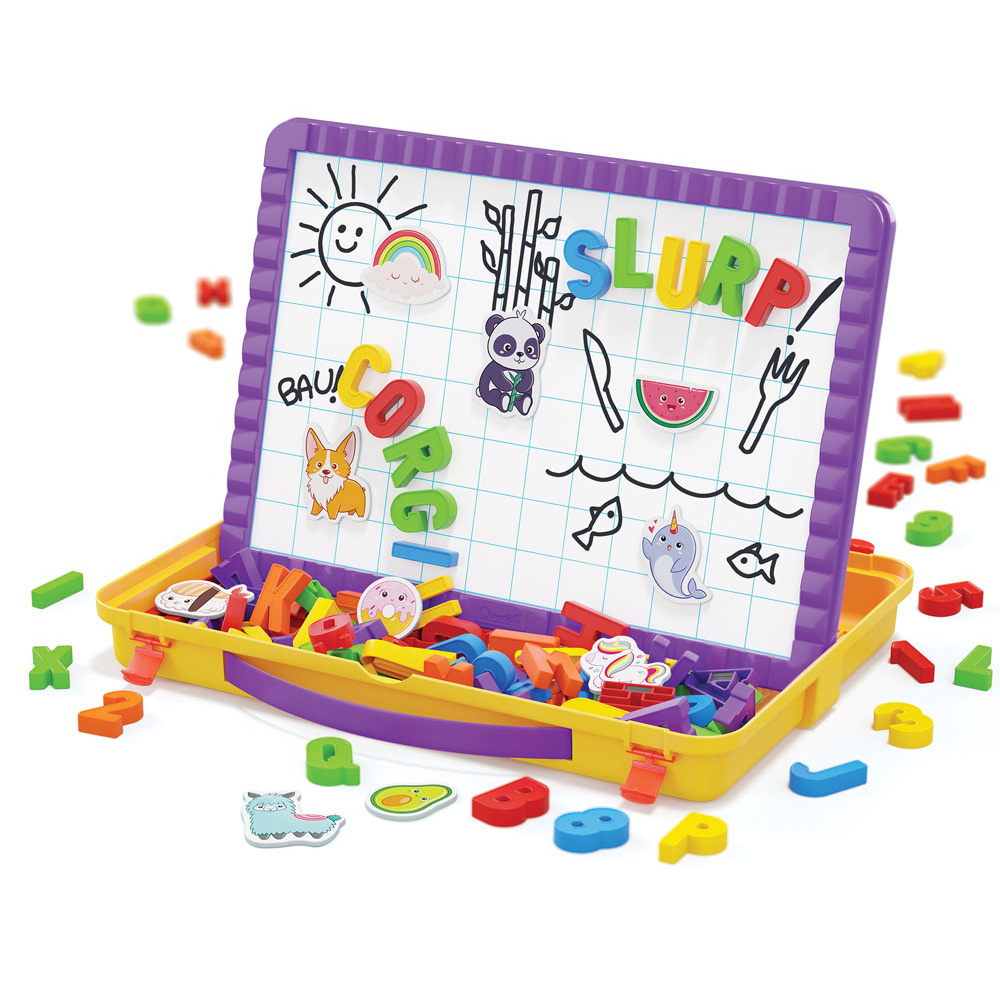 This fun magnetic letters game is a fantastic way to help you child the letters of the alphabet. It comes with 48 magnetic letters, a magnetic board in a case with handle, a dry marker, an eraser, 10 x fun illustrated magnets, and a 2-x easel stands, so it can be used flat on a table or upright on the easel stands. This simple yet highly educational toy is great to encourage your child's fine motor skills creative thinking, pre-writing skill storytelling and skills, hand-eye co-ordination. Suits ages 4 years +.