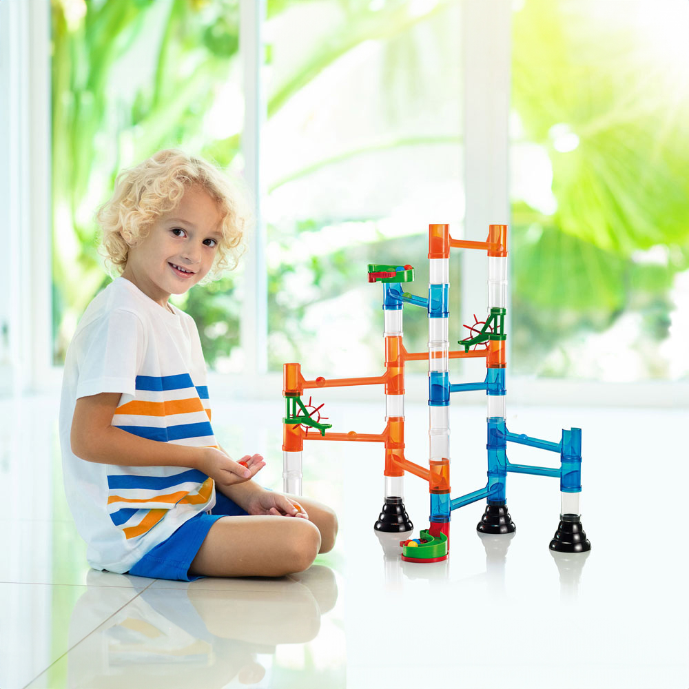 Assemble your own marble runs with this excitingly challenging construction set. Reproduce the layouts pictured on the box, or in the included instruction booklet or just have fun experimenting with new marble run designs. The interlocking chutes, bridges, pillars are transparent, so you can follow the marbles progress through the run, and spinning wheels can all be combined in countless configurations that guarantee hours of great fun. This marble run promotes creativity and logical reasoning both of which are required to place and fix the components precisely and get the marbles rolling. Comes with 10 x straight tracks in 2 transparent colours, 4 x transparent pillars/tubes/uprights, 4 x bases, 2 x swirls, 2 x starting gates, 1 x starting gate container and 10 x marbles. This toy is designed to encourage your child's manual dexterity, help to learn cause and effect, problem solving and help with their spatial reasoning skills. Suits ages 4 - 10 years.