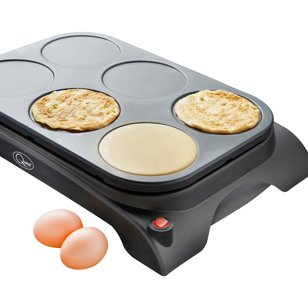 Make delicious mini pancakes, crepes and more in minutes with this Quest Black 6 Mini Pancake Maker and Grill. This device is a fun and easy way to impress family, friends, and guests when cooking and entertaining. The set includes a ladle to pour the pancake mixture onto each plate and two spatulas to flip your creations. This appliance can be used as a grill to make mini omelettes, flatbreads, burgers and so much more. You can also use the plates to cook small pieces of vegetables, fish, and meat. The pancake maker is simple to operate via an on/off switch. The indicator light allows you to clearly see when the power is on and the anti-slip rubber feet ensure your grill will stay in place during use. While entertaining guests, you can detach the power cord and put the grill in the middle of the table so that guests can help themselves. The non-stick coating provides a healthier way to cook. Making pancakes in a pan usually requires a lot of oil. However, food glides off this grill easily once cooked, meaning you can clean the appliance in seconds with a quick wipe down.