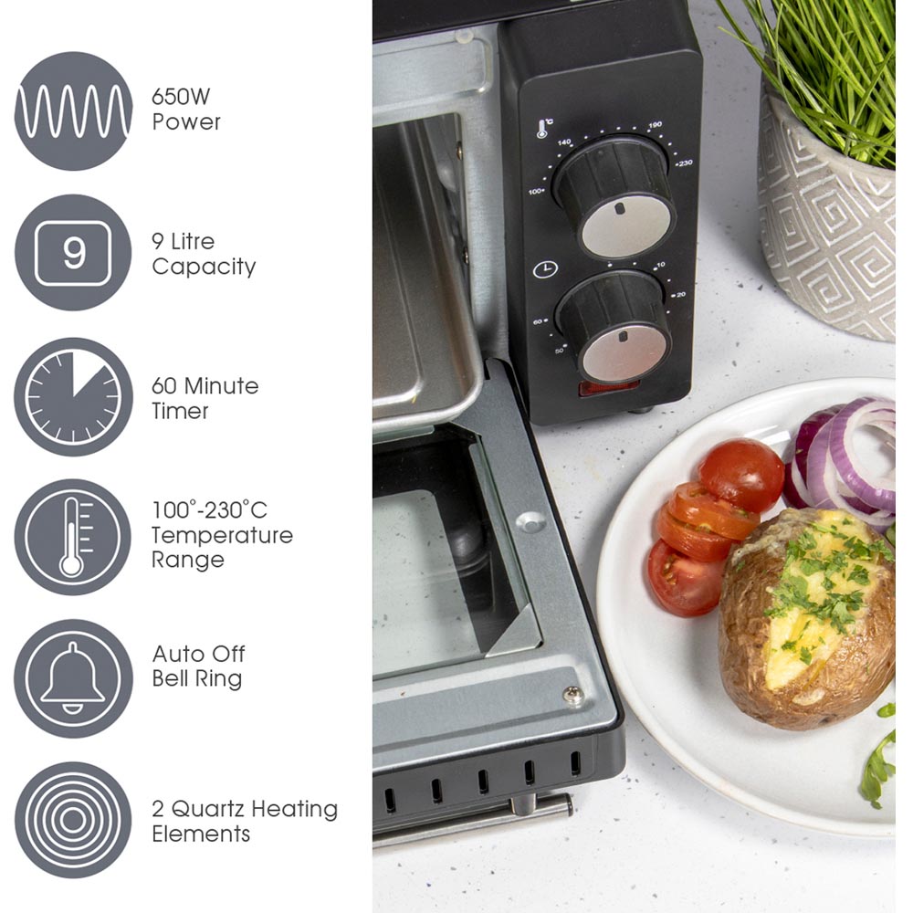 Save energy and kitchen space using this Quest Black Compact Oven. Designed to fit on a worktop, it cooks with 650 watts of power, making it an ideal option for caravans, student houses, or anywhere else that needs cooking power in a smaller space. The door features double heat-resistant tempered glass, so you can safely view your food inside while cooking. Cook your food to perfection, thanks to the adjustable temperature dial which can be set between 100-230°C, and the timer which can be set to a maximum of 60 minutes. Once the timer reaches 0, the oven will automatically shut off and play a bell ring noise to notify you that your food is ready. To make cooking easier, several accessories are included with your tabletop oven including an aluminium baking tray, a chrome wire rack for grilling, and a detachable handle to help you use the tray and rack safely.