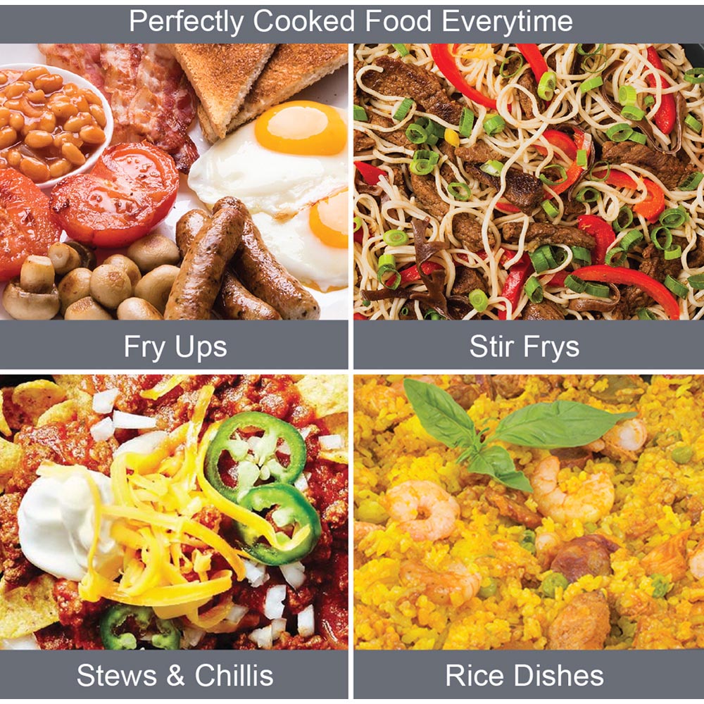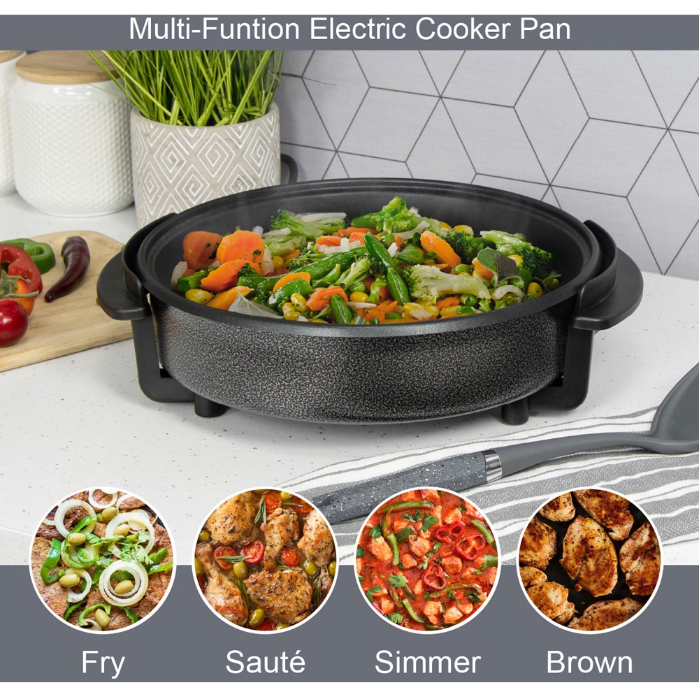 Cook different kinds of meals in this Quest Black Multi-Function Electric Cooker Pan. You can use this pan to fry, sauté, simmer and brown all sorts of different foods, whether they’re meals for one or meals for larger groups. The pan offers full control over the cooking temperature, with a temperature range between 100°C and 240°C to ensure a perfect finish. Also, the cool touch handle allows you to safely move the pan afterwards regardless of temperature, and the detachable power cable enables you to move the pan to a table for serving. A toughened glass lid is included with the pan, safely keeping any food inside while allowing you to easily view the contents of the pan. Plus, the lid features steam vents, helping to prevent any safety risks when removing the lid from the pan. The pan’s surface measures 30cm, giving plenty of cooking space, and is also non-stick, allowing you to easily move any food from the pan to the plate while making cleaning much easier afterwards.