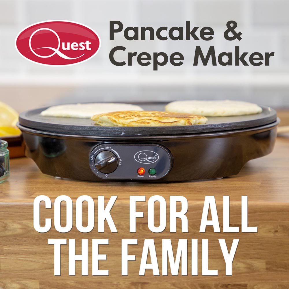 Enjoy easy cooking with the Quest Black Pancake Crepe and Flatbread Maker. This electric pancake maker is the perfect kitchen appliance to provide you with delicious homemade pancakes and crepes in just a matter of minutes. This maker features a 12-inch non-stick hot plate that will cook your sweet treats perfectly, and not have them stick to the base during the cooking process. Once you’ve made your pancakes the surface is super easy to wipe clean once cooled down. The surround of the electric pancake maker hot plate is slightly raised to keep your mixture on the hot plate and reduce spillage/waste. Also, the hot plate reaches temperatures of up to 220°C and has an adjustable temperature gauge so you can cook the perfect pancakes your way. Not only does this hot plate cook delicious pancakes and crepes, but it is also suitable for making omelettes, chapattis, & rotas, amongst many others. In order to create the perfect pancake the set comes complete with a wooden spreader and spatula.
